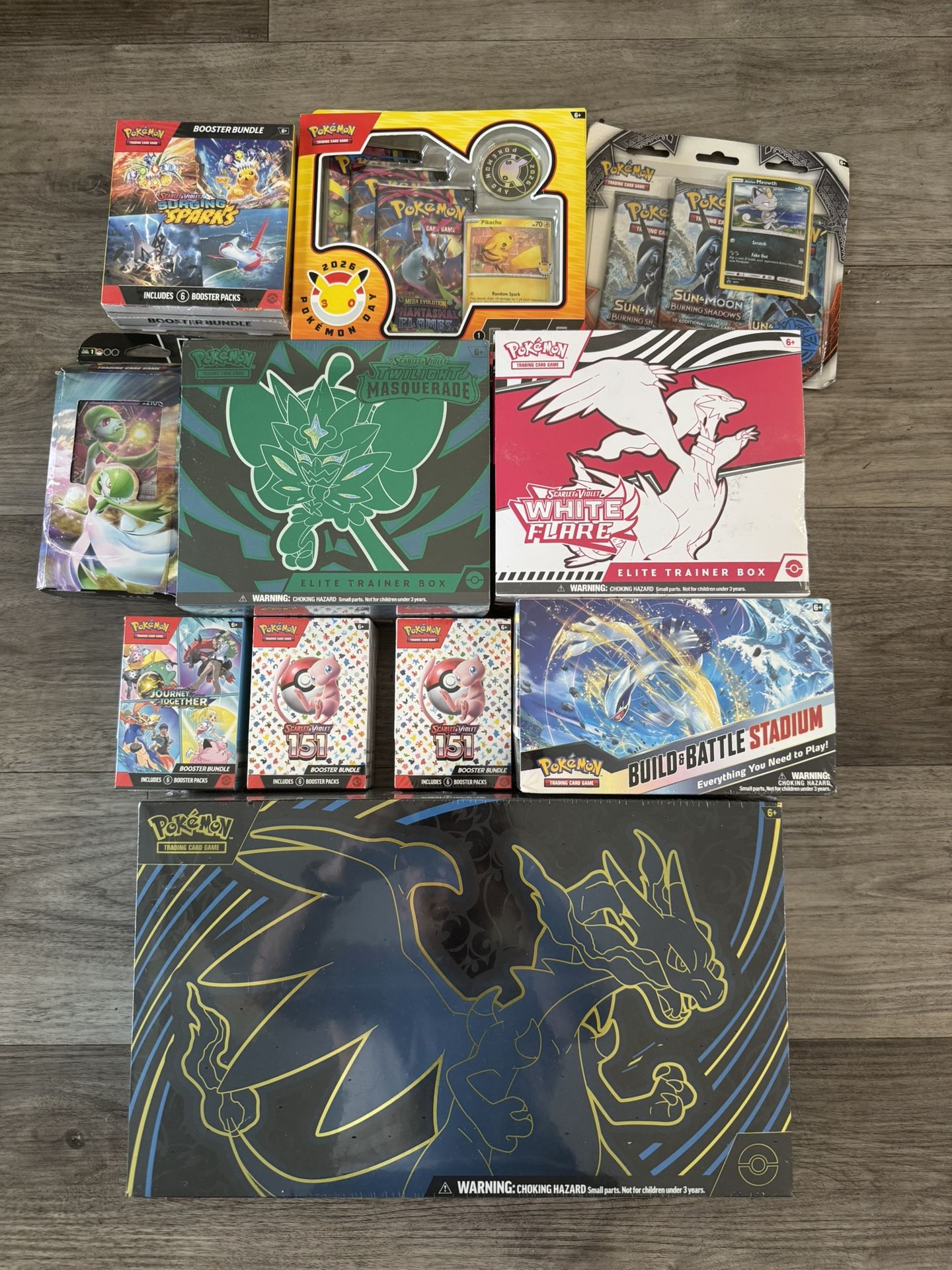 Prices listed below. Will work bulk deals. Local meet up Henderson/Vegas. Cash or Zelle. White Flare etb $95 151 booster bundle $190 SOLD Silver Temptest Stadium SOLD Twilight etb $80 Mega Charizard UPC $175 (small tear) Surging sparks bb $50 Journey together bb $40 Burning Shadows 3 pack blister $120 Gardevoir V deck $20 Pokemon day SOLD