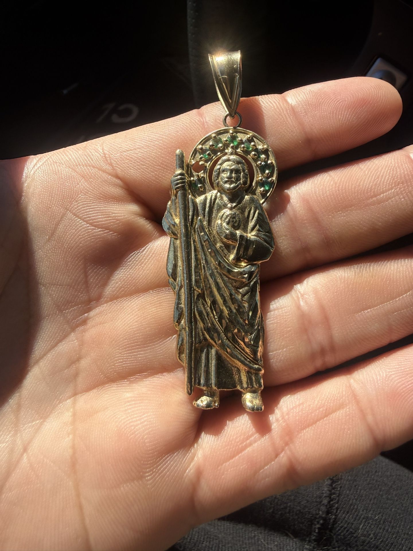 10KT solid gold San Judas pendant. Tested at gold shop and weighed at 9 grams. Bring in your own tester if needed.