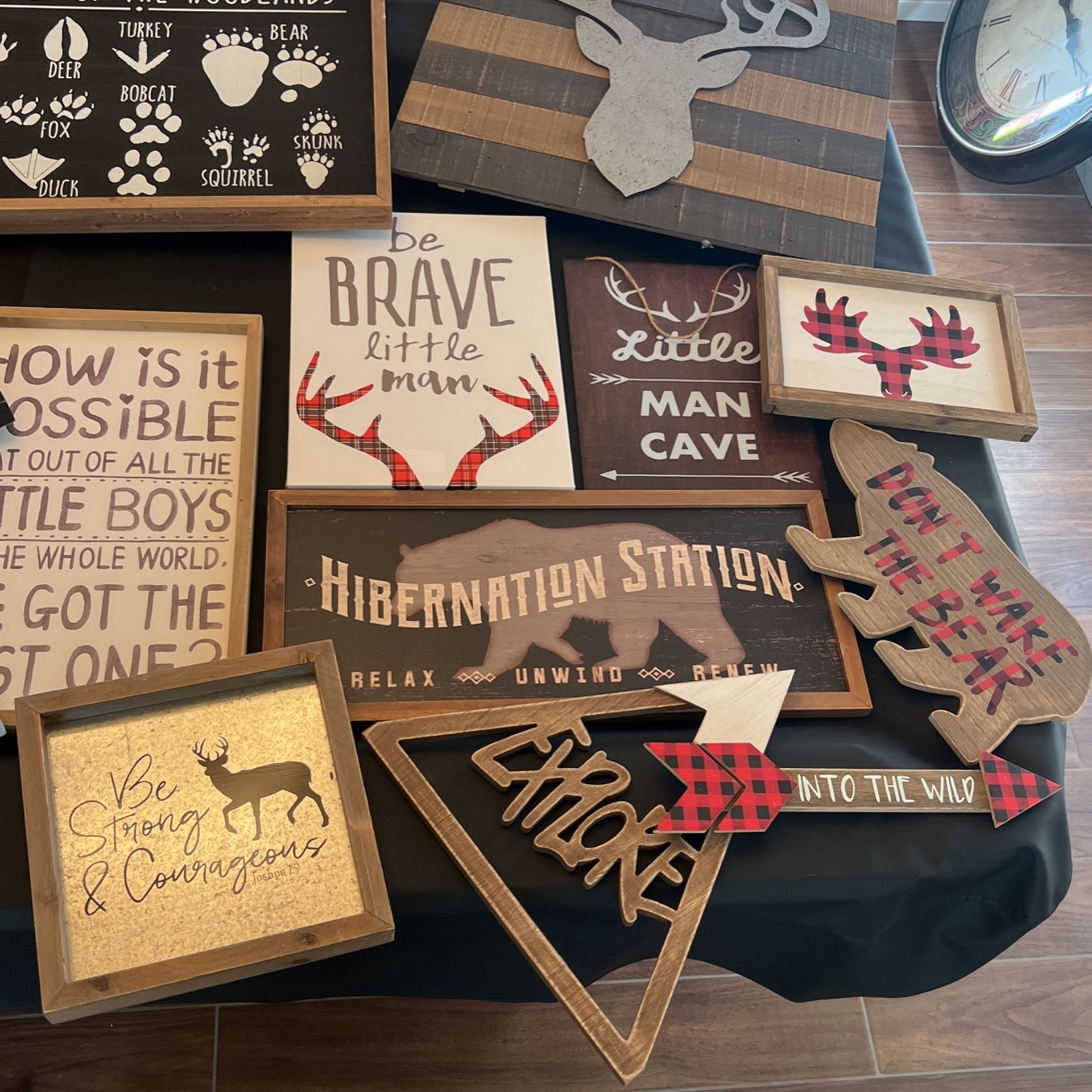 Wall hangings and sculptors for a baby boy room woodland themed. Best One Trap sign Little dude sign Deer head large Courage deer Hibernation station Explore Small arrow Indian arrow Hanging arrow Wake the bear Moose head Man cave Be brave Foot prints Tee pee Bear sculptor Selling all pieces for 10$ a peice or all of it for 150$