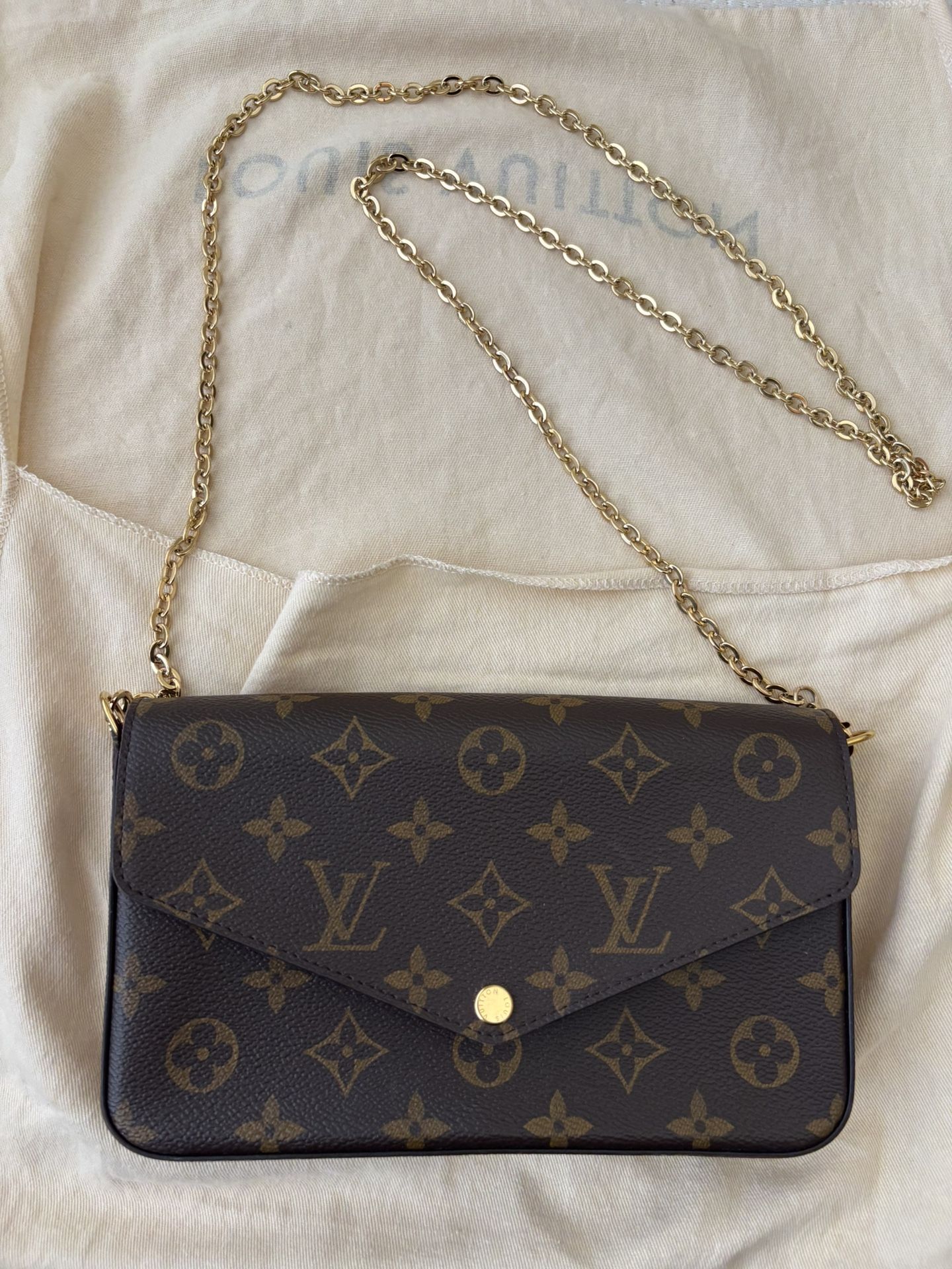 Authentic and cute LV Pochette Felicie in monogram print. Great condition. Purchased in 2023. Two inserts — card holder and zipped pouch — and detachable gold chain are included. Receipt, LV dust bag, and box are included. Serious buyers only.