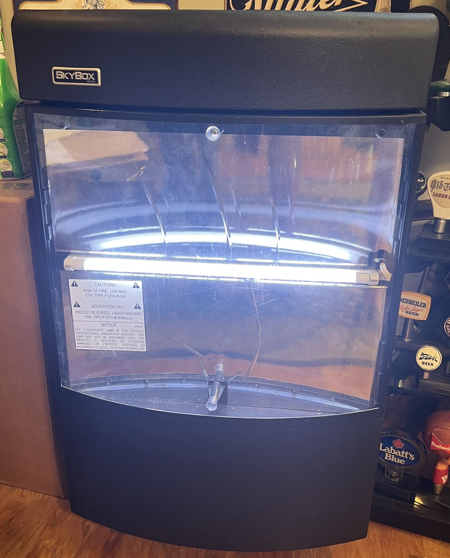 One very clean Skybox by Maytag refrigerator. It includes a flip top storage area, beverage bin, 4 casters, great for the media room, dorm room, rec room or man cave. The Skybox allows for a separate interchangeable backlit front display of your favorite sport, team, or your own design (not included but available online). Specifications: 2.8 cubic foot capacity, designed to cool to 35 degrees. Holds up to 4 cases of ice cold beverages, indoor bottle storage, convenient can rack storage, and removable flip top cover doubles as an ice beverage bin, 4 heavy duty casters for easy moving and an 8 foot cord. Measures 35 x 19 x 22 inches. Local pick up only. See picture overall cont, some Maytag promotional pictures are also included.