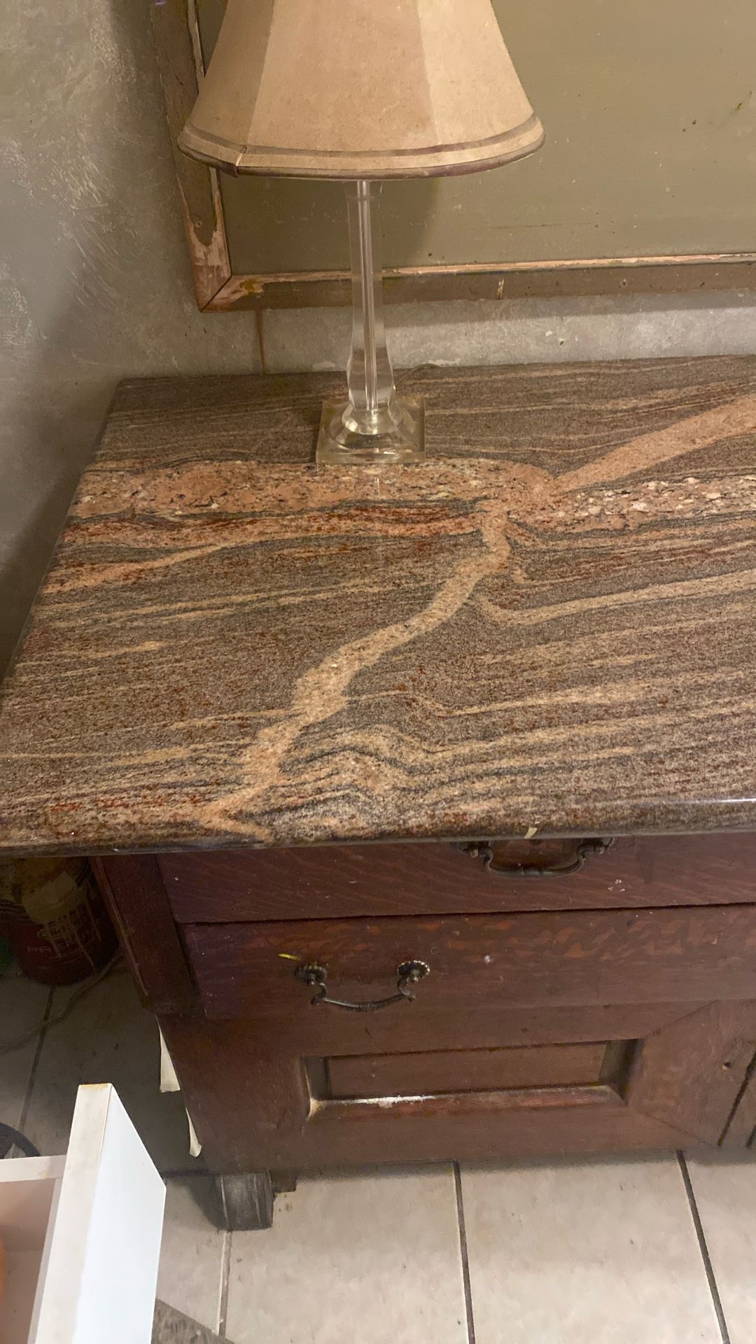 53 inches long by 26 inches front to back curved on left and front right side straight cut 3/4 thick in great condition Granite is sitting on dresser to take photo not attached colors dark brown ,grays ,little pink , tan, and rust, dark reddish brown great colors one of a kind well you know what I mean