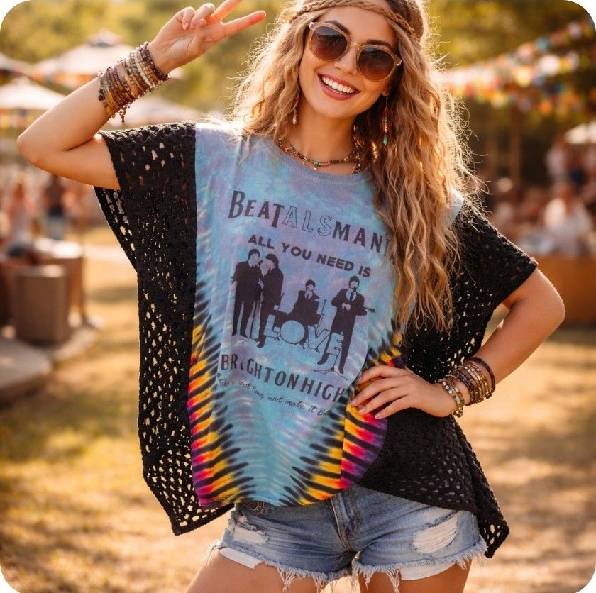 Beatles Hippie Crochet Poncho Tie-Dye T-Shirt Retro Boho Collector Festival