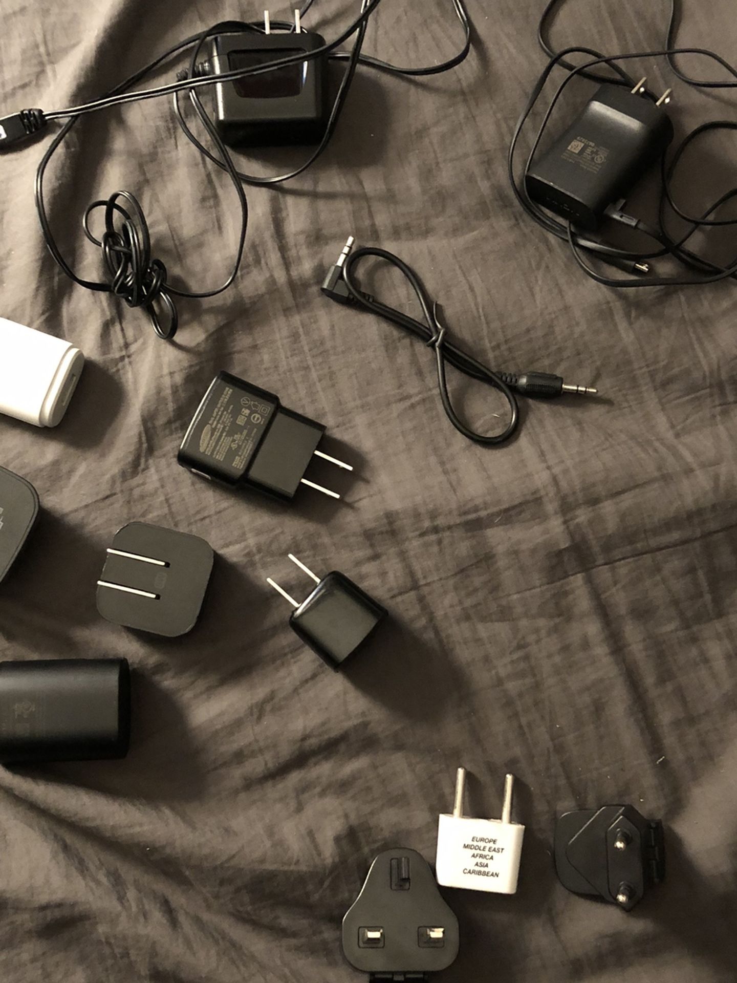 2 android chargers, 6 outlets, 1 aux cord, and 4 European adapters
