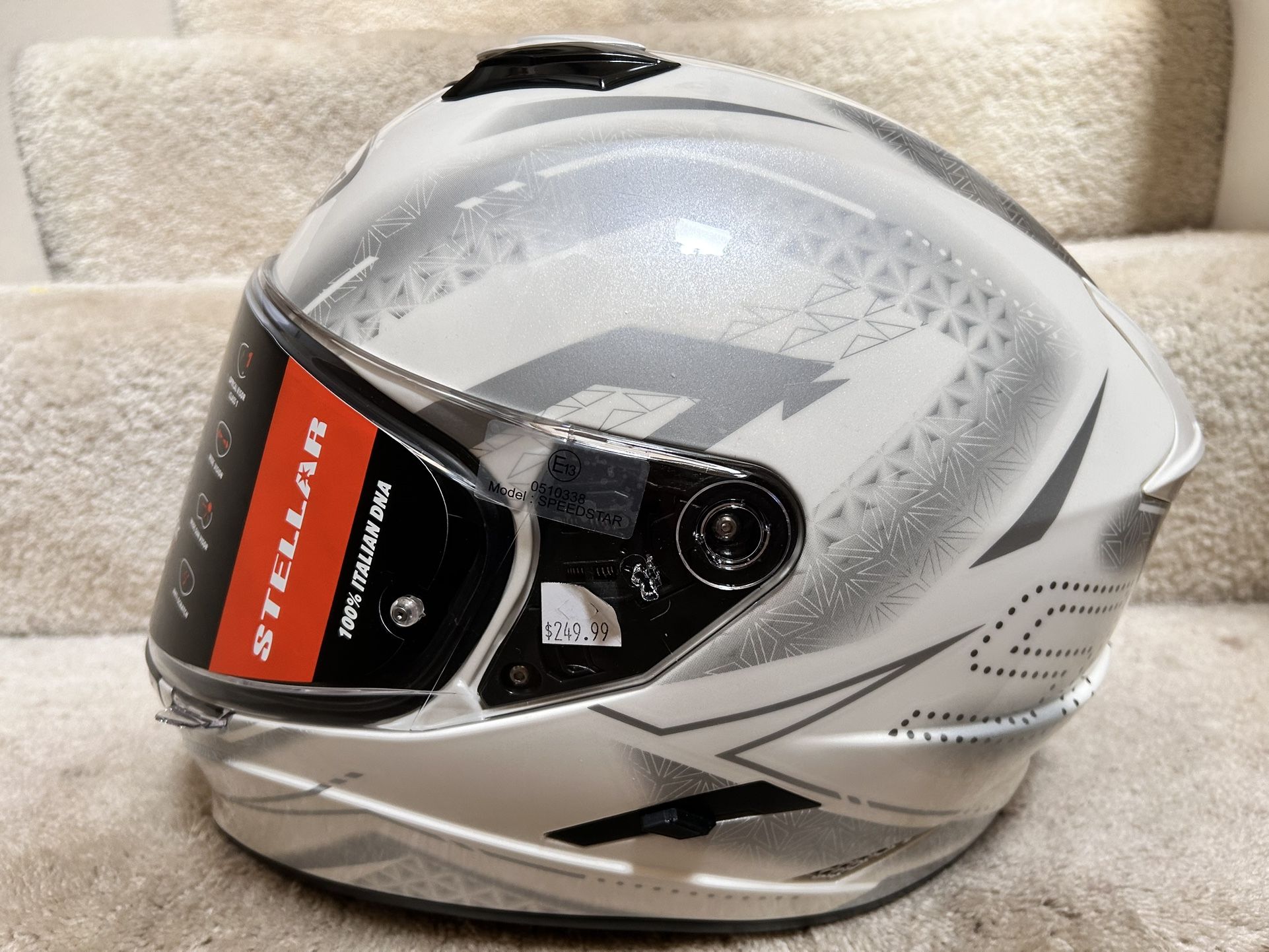Suomy Stellar helmet with advanced thermoplastic, wind tunnel tested, clear visor. Size M Gloss white with silver design Never used DOT certified Pinlock anti scratch Stellar model with a drop down internal visor. 100% italian DNA Tags: Motorcycle bike suzuki honda yamaha kawasaki Japanese American harley buell cruiser sportbike rr bmw ducati aprilia gsxr cbr r6 r1 zx evo crf kx yz 250 450 125 rm atv quad