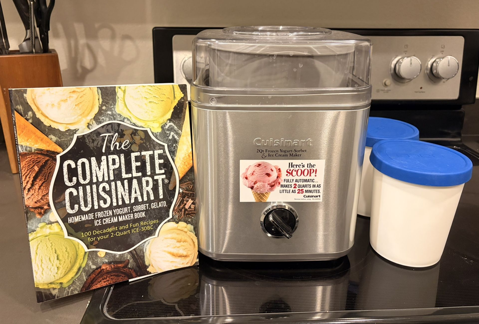 Selling a gently used 2qt Cuisinart frozen yogurt, sorbet and ice cream maker + a recipe book and 2 ice cream containers to store the frozen treats in. The recipe book is gently used and one page has some notes on the side. Must pick up