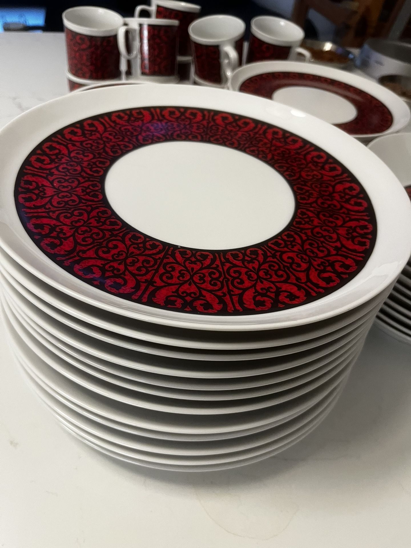 Everything in great condition! High quality fine China made in Japan. Full set includes: 12 plates 12 shallow bowls 12 small plates 10 tea cup plates 10 cups
