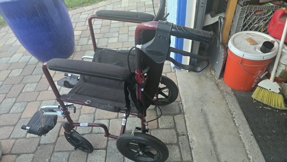 Transport chair with foot rest, hand brakes and collapsible back rest.