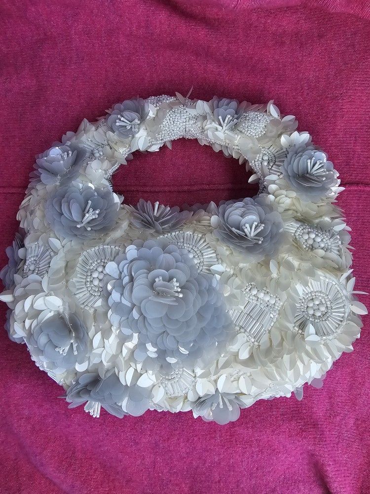 Viral Handcrafted in India White/Gray 3D Floral Beaded Crescent Bag Mini Bag NWT