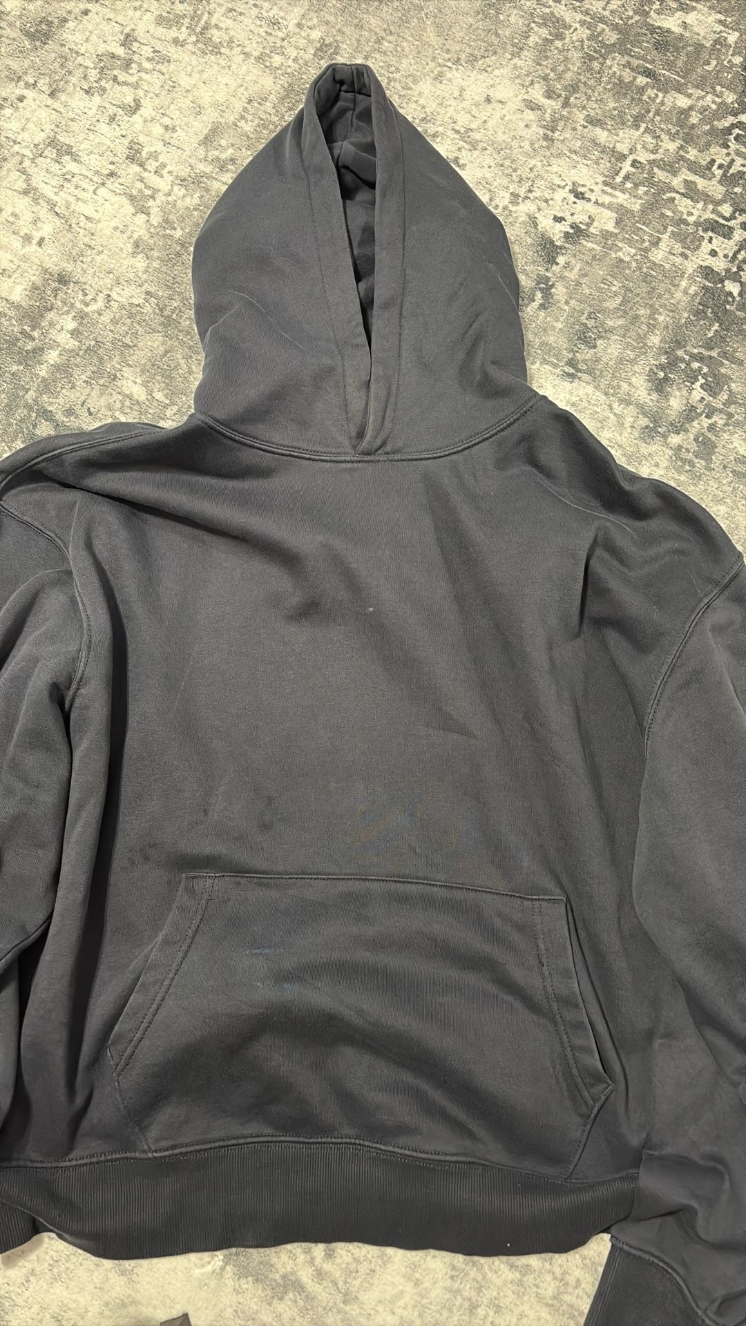 it’s oversized and was big on me. it’s a nice blue color and has some strings but it’s really good still