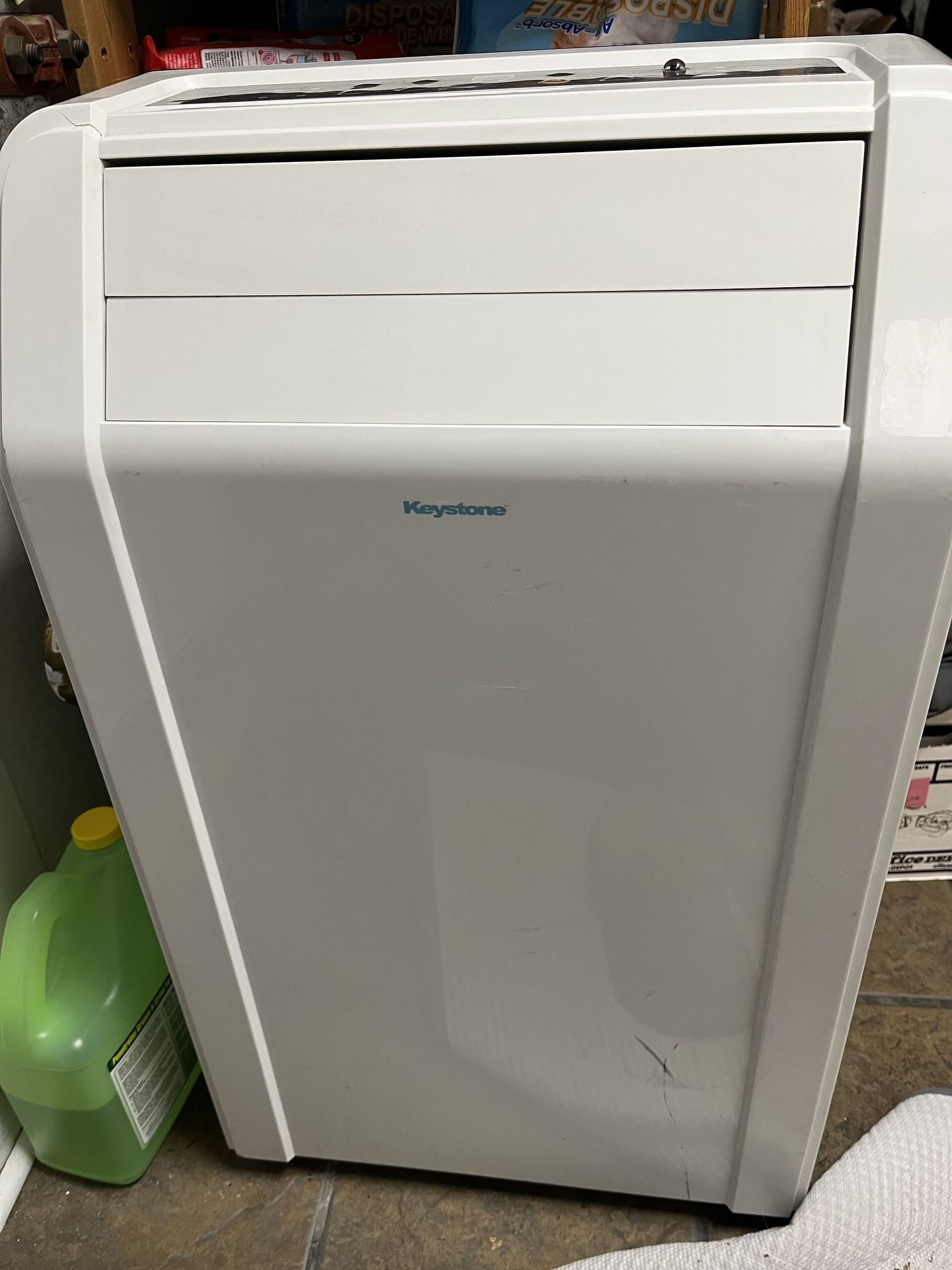 Keystone portable AC with the hose and attachments for the window. It comes with a hose extension kit I was using. It’s about 10 years old and doesn’t seem to cool as much as it once did, but it still worked the last time we used it, which was summer of 2024. Needs a little cleaning, and if you know how to work on an AC maybe you can get it back to what it once did.
