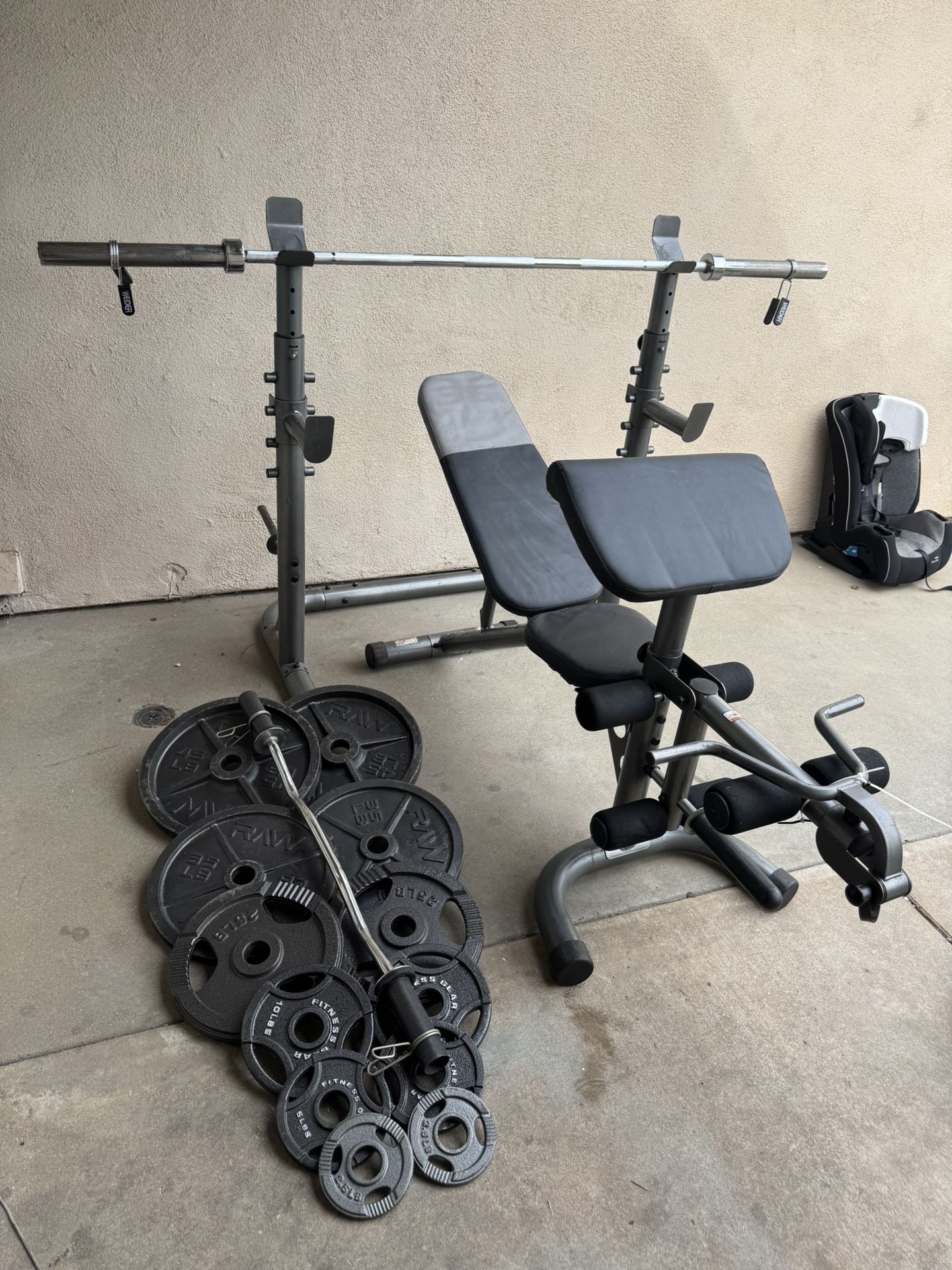 Bench press/squat rack with 7ft 45lbs bar plus 245lbs of Olympic weights and curl bar