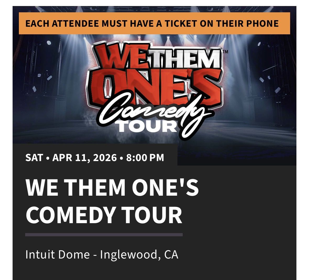 Cannot attend anymore unfortunately .. so selling them . I would have to transfer the tickets to you from Ticketmaster app. Lmk if interested section main 06 row 20