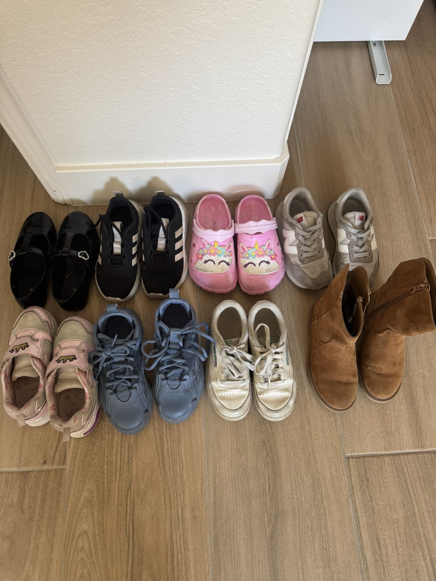 Black cat and jack shoes size 12 $7 Adidas black tennis shoes size 11 $12 Pink slippers size like new 12 $8 New balance grey size 12 $ 15 Princess light up shoes size 12 $ 7 Reebok tennis shoes size 12 $ 12 Cat an jack boots size 11 $ 8
