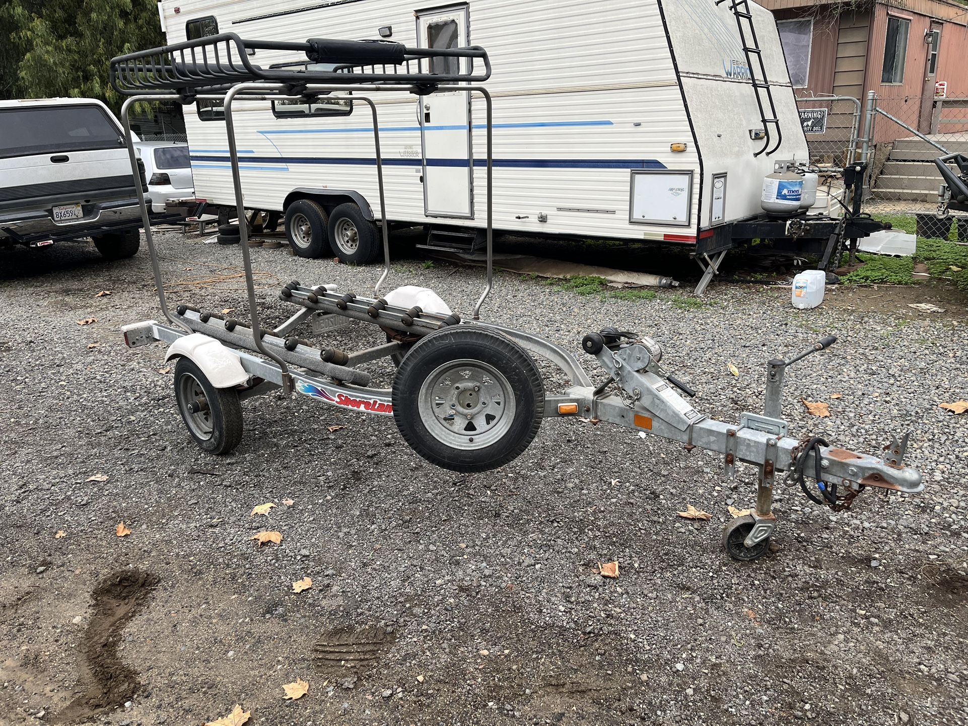Selling a galvanized Shorelandr single Pwc, jetski, seadoo trailer. Trailer is 12’ -8” from tongue to the back of the bunks and fits 3 seater skis. All lights work, title in hand and tows great. Just towed it 400 miles without issue. Came with a ski that I bought and i have no use for another trailer. Rack is removable. Asking $750 obo. I will not respond to “Hi, is this still available?” Post will be removed once sold.