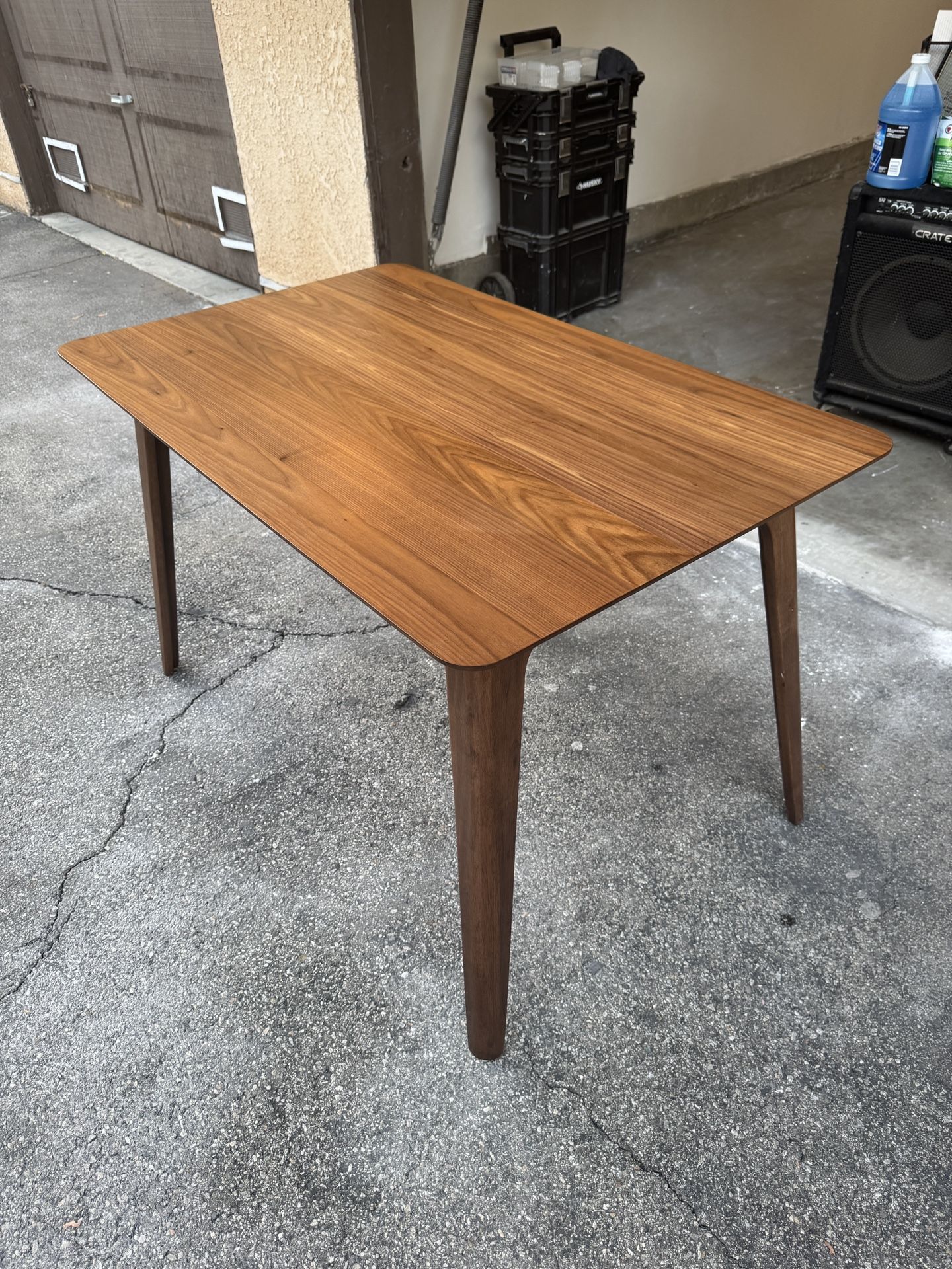 Mid century Modern MCM walnut dining table. Purchased from Wayfair. Gently used. A few small surface scratches but not very noticeable. Pick up from Highland Park. Dimensions: 29.5" H 47.2" L 29.5" W