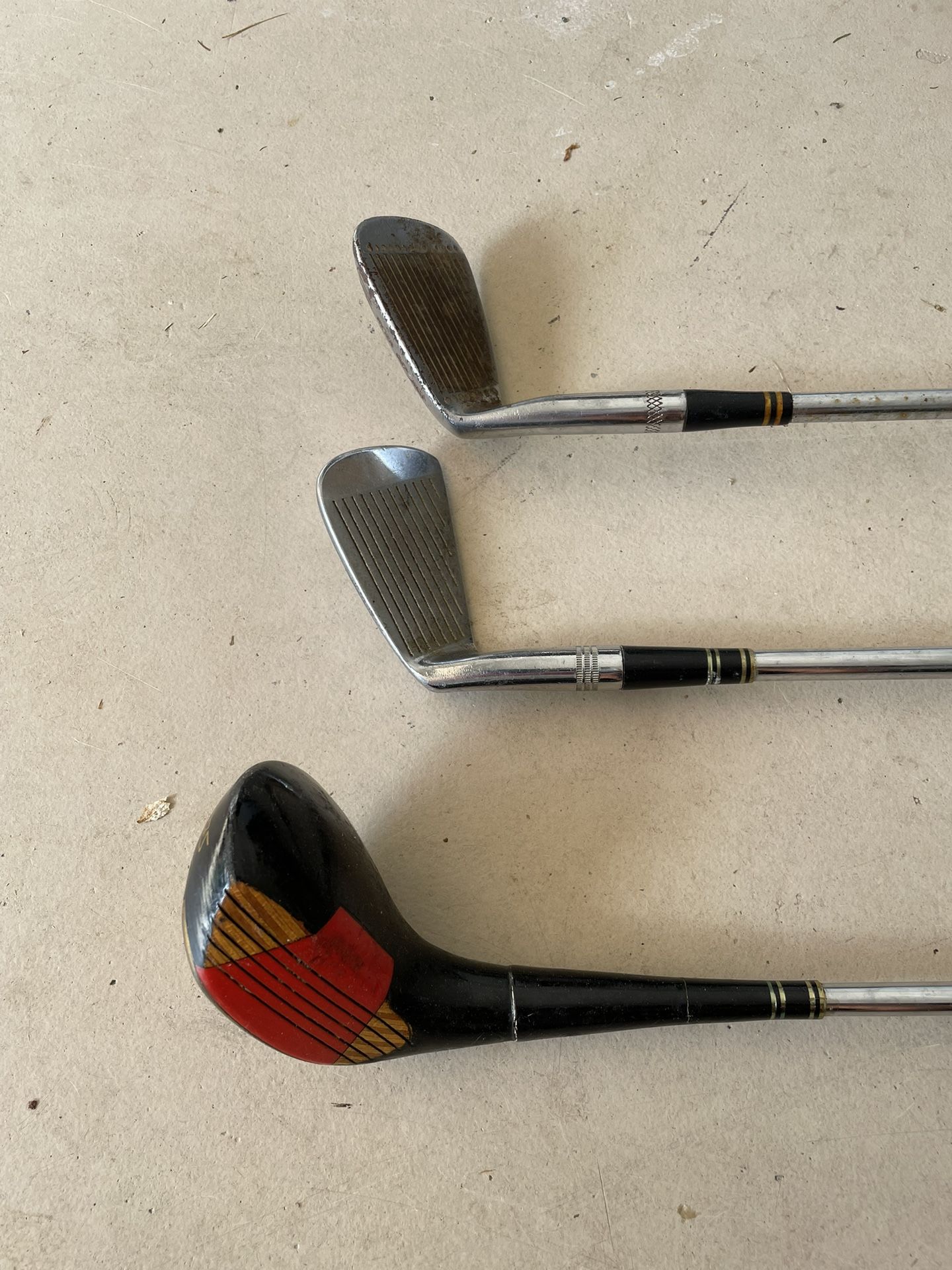 Beautiful wood and two irons. For decoration or use on the golf course. Price is for all three.