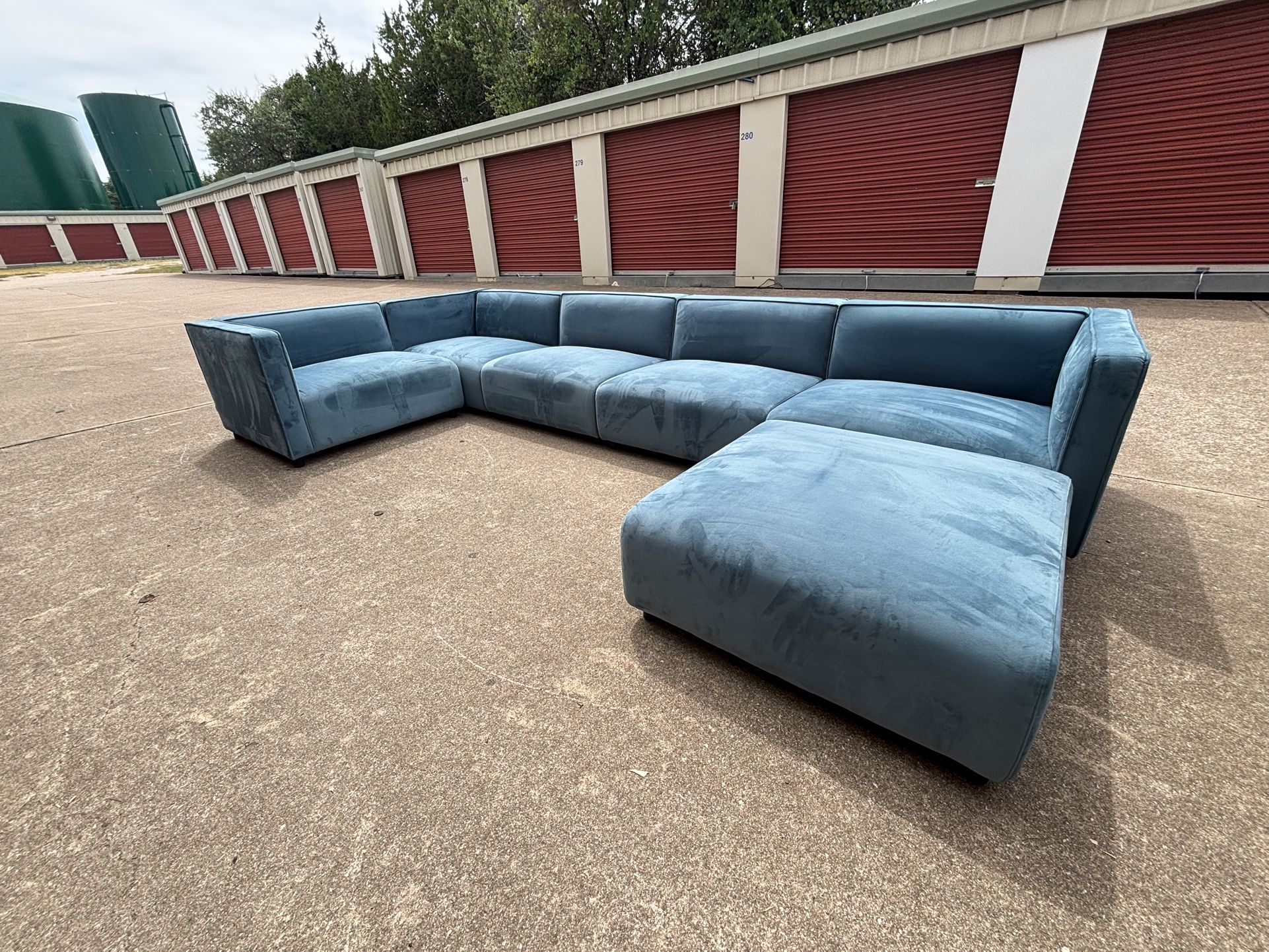 Arya Modular Sofa w/ Open End and Arya Modular Loveseat in Solstice Plush Velvet purchased new from Rove Concepts for ~$7K. Performance fabric easy to clean. Modular design, can be put together as one large sectional or separated out. Middle pieces are 35”W x 36”D x 26.5”H, corner pieces 39.5”W Offering free delivery within 20 miles. Addrional miles will be an extra fee.