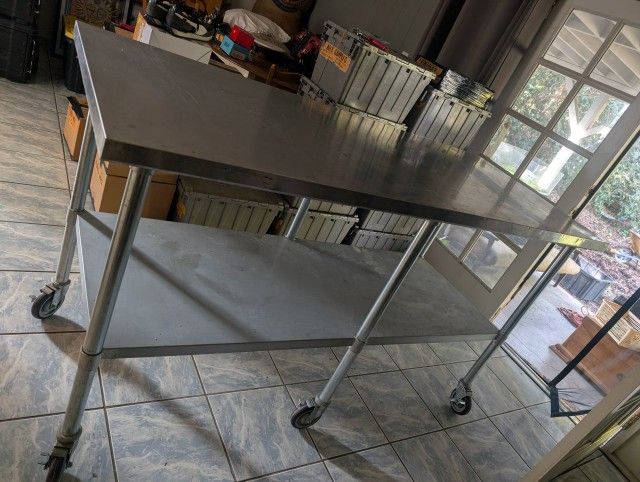 Gsw brand stainless steel work table. Great for crafts, kitchens etc. used but in great conditions. Some small cosmetic staining on the top. On casters. Measurement: 72 in wide 30 in deep 40 in tall