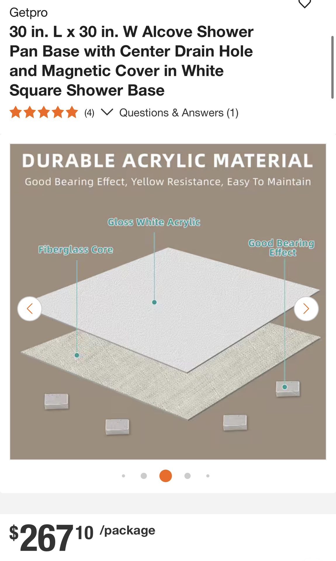 gsb3030c Dimensions Base Height (in.) 3.75 Base Length (in.) 30 Base Width (in.) 30 Threshold Height (in.) 3 Details Approximate Length x Width 30 x 30 Color Family White Color/Finish White Drain Location Center Features Low Profile Included Base, Drain Installation Type Square Material Acrylic Product Weight (lb.) 18.5 lb Shower Type Alcove