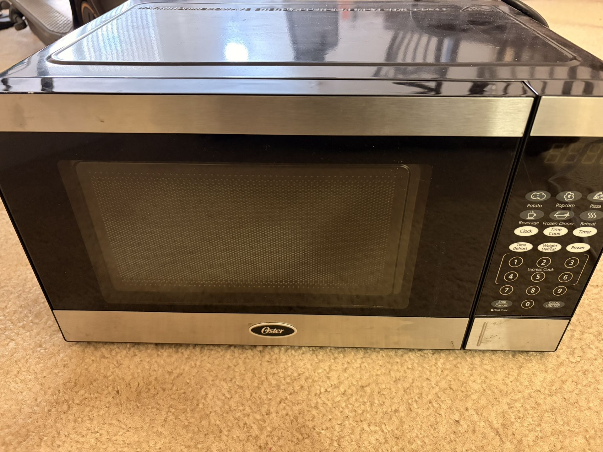Oster Compact Size Microwave Oven 0.7-Cu. 700w with stainless steel door trim. Working in good condition.