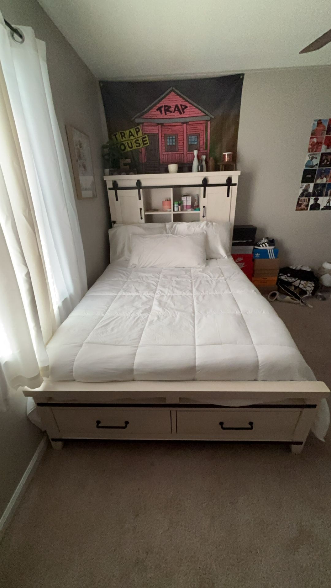 LOWERED PRICE! i just recently realized the bed of both sliding doors has VERY SLIGHT and barely noticeable pink spots they may be able to come off with furniture cleaner but i have none that’s why i lowered the price, there’s outlets in the bed to charge your phone and many places to put things. If INTERESTED- will send more pictures. will take any price just throw me a price . THE BED OVERALL IS VERY VERY STURDY AND HARD TO TAKE APART! which is a good thing because NO WAY is this bed breaking
