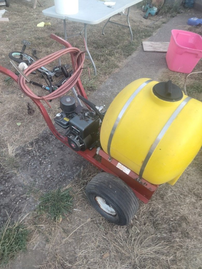 See photos this is a small farm or pestacide man sprayer gas powered easy to roll 25 gallon sprayer