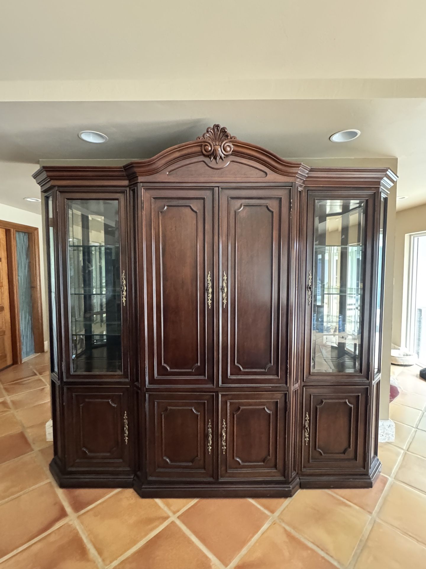 Century Armoire. Side display areas with glass shelves, center storage/tv, and bottom storage areas. Total unit measures 93 inches wide, 22 inches deep, 90 inches tall. Unit separates into 4 sections for easy transport.