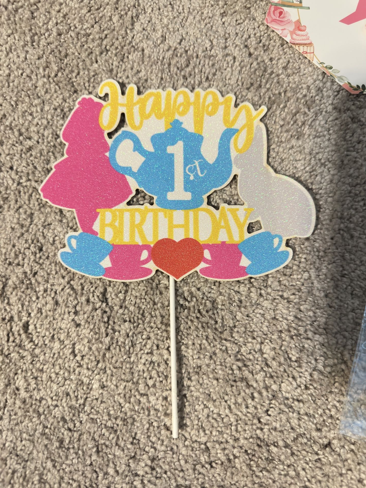 White wood signs ONE (will sell these separately) 2 x Cloth backdrops Wonderland banner Cake topper 3 red heart Mylar balloons Pink number 1 Mylar balloon Happy Birthday selfie board