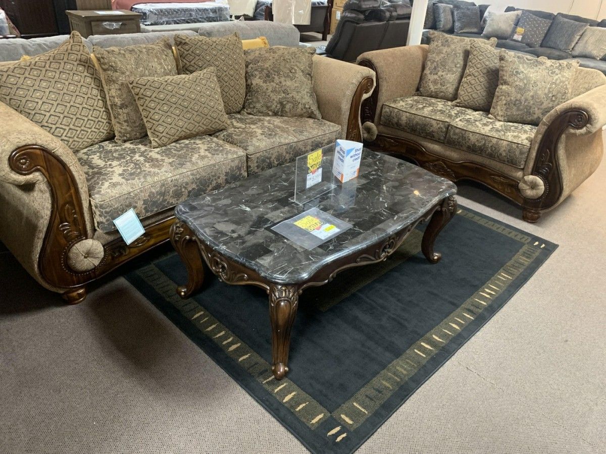 Will easily last for years of daily use Sofa and loveseat- Was $2999.88 Now $2499 (floor sample) Rich Carved Wood Trim Gorgeous Sofa & Loveseat Set Carved Wood Plush Comfort Timeless Look Solid & Sturdy Construction Turn your living room into a warm, elegant space with this luxury 2-piece sofa and loveseat set. From the rich upholstery to the hand-carved wood trim, this set delivers a high-end designer look at a price that wont break the bank. Built to hide wear pet- and guest-friendly Transform Your Home for Less From Entry-Level to Luxury! Strong wood frame with durable suspension and corner block reinforcement High-end chenille-style fabric in a neutral mix of earth tones (beige, brown, gold) Huge selection of traditional & modern furniture + mattresses starting at $89! Includes 8 matching designer throw pillows with mixed patterns (floral & geometric) Classic Woven Fabric Upholstery Just 5 min from I-83 Free easy parking 20,000 sq. ft. showroom (formerly Eddies Furniture & Mattress) Elegant rolled arms and button accents on both sides Fast & Simple Process Deep seating with a supportive yet soft feel great for relaxing, guests, or family time Thick, Plush Cushions Same-day shopping take home your furniture today Features & Highlights: No hidden fees everything is upfront within 14 days (depending on schedule) Real hardwood framing with deep scrollwork and carved details on arms, legs, and base At Premium Furniture Outlet, youll find stunning furniture and mattresses at prices that fit every budget. Whether youre looking for modern, traditional, or luxury styles weve got it all un Dont wait your dream home is just one visit away! Visit Premium Furniture Outlet ured for a rich feel and upscale appearance Why Shop With Us? Back and seat cushions are reversible for longer life
