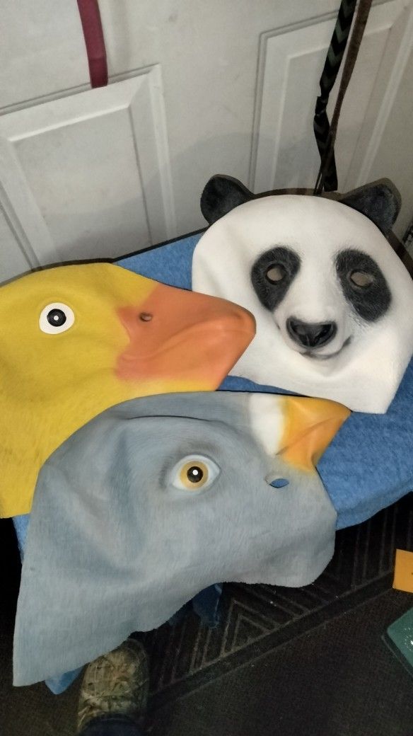 One mask of a panda one mask of a pigeon one mask of a duck all are in good shape no holes where they're not supposed to be