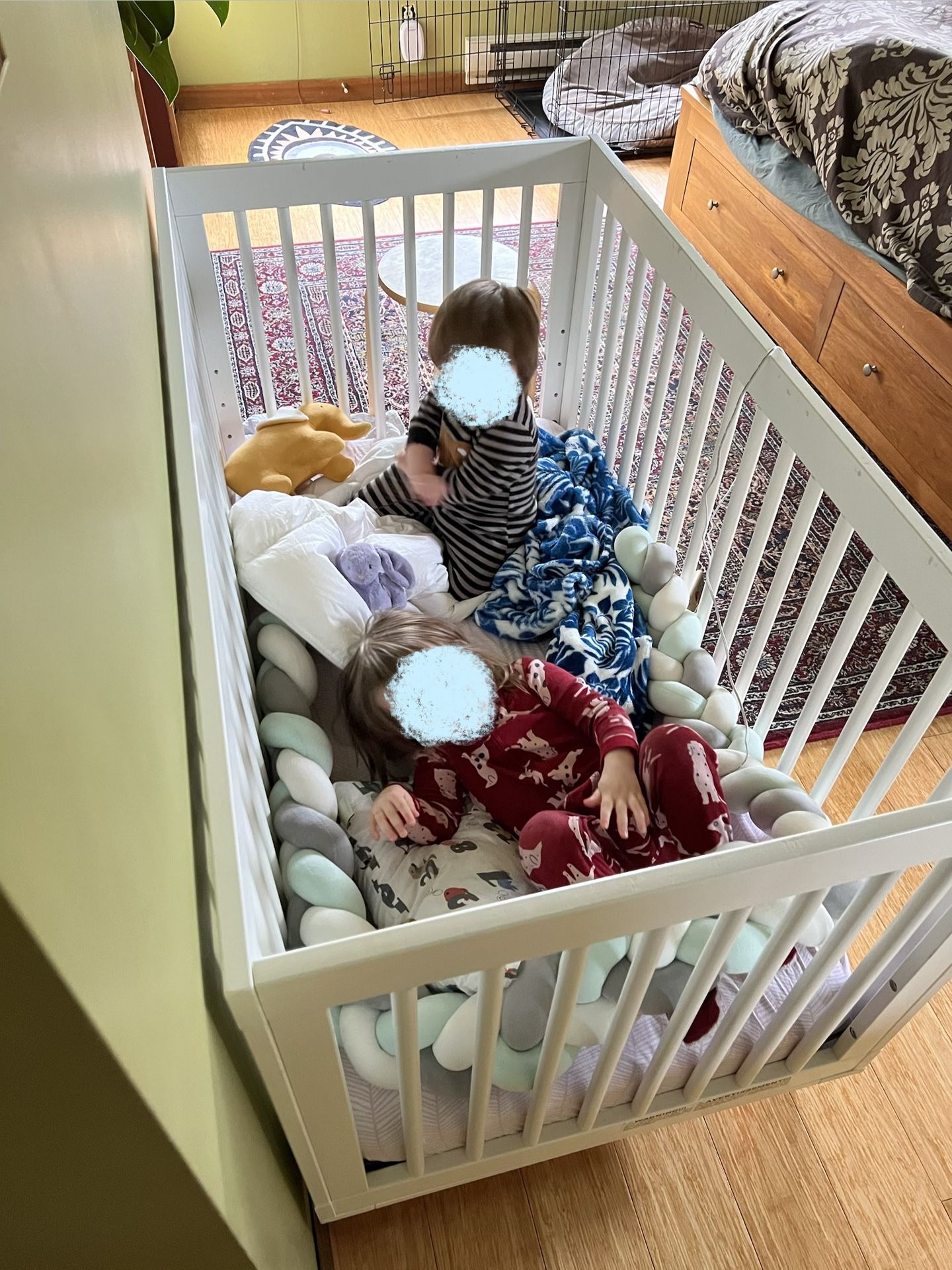 White, wooden convertible crib with extra side that makes it a bed. Comes with a mattress and linens. Great condition and has all the parts.