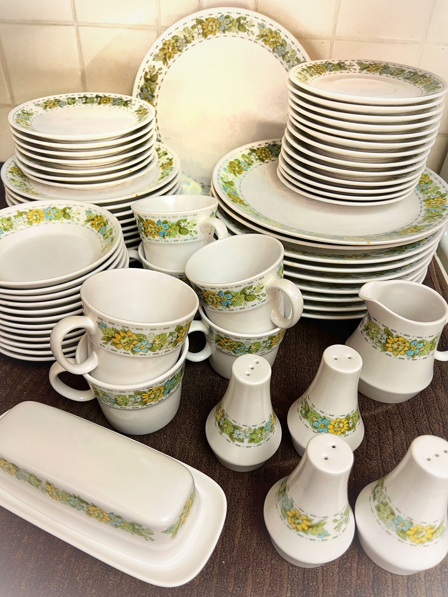 1969 Noritake Progression “Springfield” 65-piece dinnerware set. This sturdy, microwave- and dishwasher-safe dinnerware was produced through 1978. Its and is the perfect match for your post-Summer-of-Love dining table. $90 10 dinner plates 10 salad plates 7 dessert plates 12 berry bowls 6 cups 13 saucers 2 pair salt-and-pepper shakers covered butter dish creamer