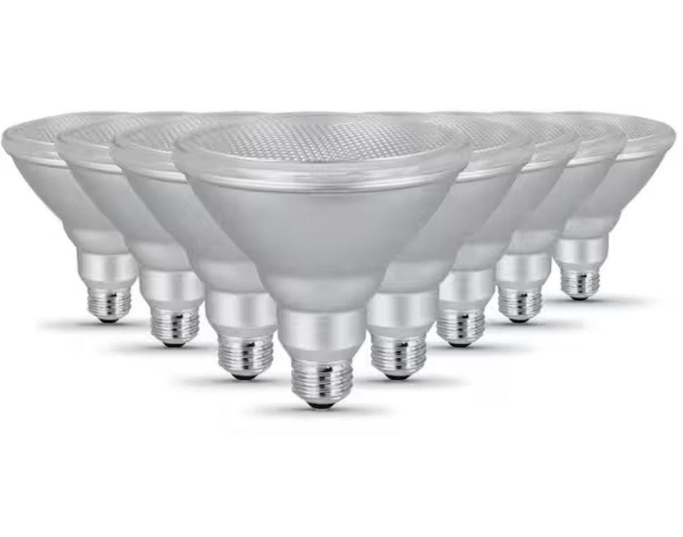 Light Bulbs Open Box New The Feit Electric 8-pack, 11.1-watt (90-watt equivalent) PAR38 reflector LED flood light bulbs feature our highest quality and most energy-efficient lights to date. Their crisp 3000K Bright White glow produces a friendly and relaxed environment ideal for landscapes, office buildings, basements, garages, and other high-ceiling applications. These high-performance LED bulbs feature enhance vivid natural light with a high color rendering index (CRI) of 90+ which emanates more realistic, vibrant colors. They also produce a significantly more energy-efficient light output when compared to traditional 90-watt incandescent light bulbs. The PAR38DM/930CA/2 bulbs emit 1000 lumens each, and the estimated energy cost is only $1.34 per year. With an average life span of up to 25,000 hours/22 years, these bulbs last longer than the equivalent incandescent light, saving you replacement costs and time. Each LED bulb has a 40° beam angle making it perfect for settings that require precise lighting. The versatile PAR38 LED light bulb is fully dimmable, giving you the ability to adjust the amount of light to suit any scenario. The LED light bulbs are energy-saving and CEC title 20 compliant. Their weather-proof design makes them ideal for use in any indoor or outdoor applications with medium E26 base sockets. Create long-lasting, energy-efficient, illuminating rays that will brighten any home or commercial space. 90-Watt equivalent LED light bulb PAR38 shape light bulb with medium (E26) base Ideal for outdoor, recess and track lighting applications Full range dimming with even light distribution Brightness: 1000 Lumens Light appearance: 3000K (bright white) Input line voltage: 120-Volt Suitable for outdoor use and rated for wet locations Beam angle: 40° California Energy Commission (CEC) Title 20 compliant Estimated-yearly energy cost: $1.34 (based on 3-hour/day, 11/kWh, costs depend on rates and use) Energy used: 11.1-Watt (equivalent to a 90-Watt standard incandescent light bulb) Average life: upto 22.8-years (based on 3-hour/day) Mercury free Instant on to full brightness 90+ high CRI color rendering light bulbs allow colors to appear more realistic and vibrant No ultraviolet light, safe for artwork Here at SELZALOT We also offer a wide range of products and services to enhance your lifestyle and home. Whether you're looking for Beard growth kits ,Beard pen fillers, lighting, Vanity lighting, Chandeliers Wall lighting Light fixtures, Toys, Baby gear, Appliances,furniture, home decor, medical equipment, health and beauty products, sinks, office furniture clothing, and more, we have it all. We invite you to explore our diverse selection and find the perfect items to meet your needs.