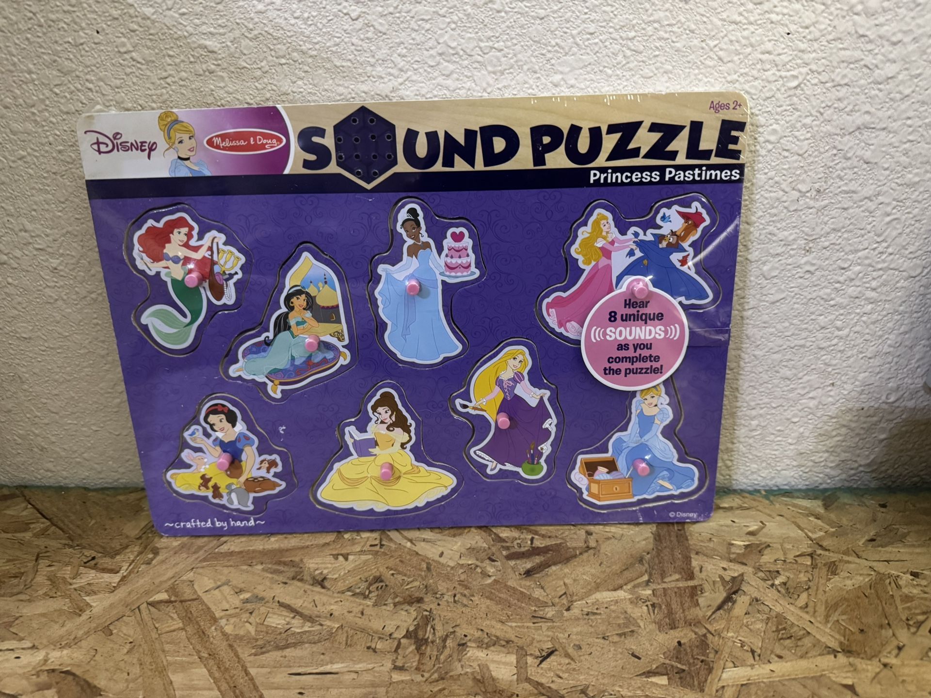 Learn all about the favorite hobbies and pastimes of Disney’s princesses with this enchanting sound puzzle! Place the eight pieces in the sturdy wooden puzzle board to hear about each classic character—Ariel, Jasmine, Tiana, Aurora, Snow White, Belle, Rapunzel, and Cinderella. Light pieces and sturdy plastic pegs are great for grasp development and easy maneuvering, making this a perfect preschool puzzle. Matching artwork underneath the pieces helps kids place them in just the right spots. 8-piece wooden sound puzzle featuring Disney princesses and what they like to do Light wooden pieces with sturdy plastic pegs Pieces play sound (description of the princesses’ favorite activities) when placed in wooden puzzle board Matching pictures under each piece Ages 2+