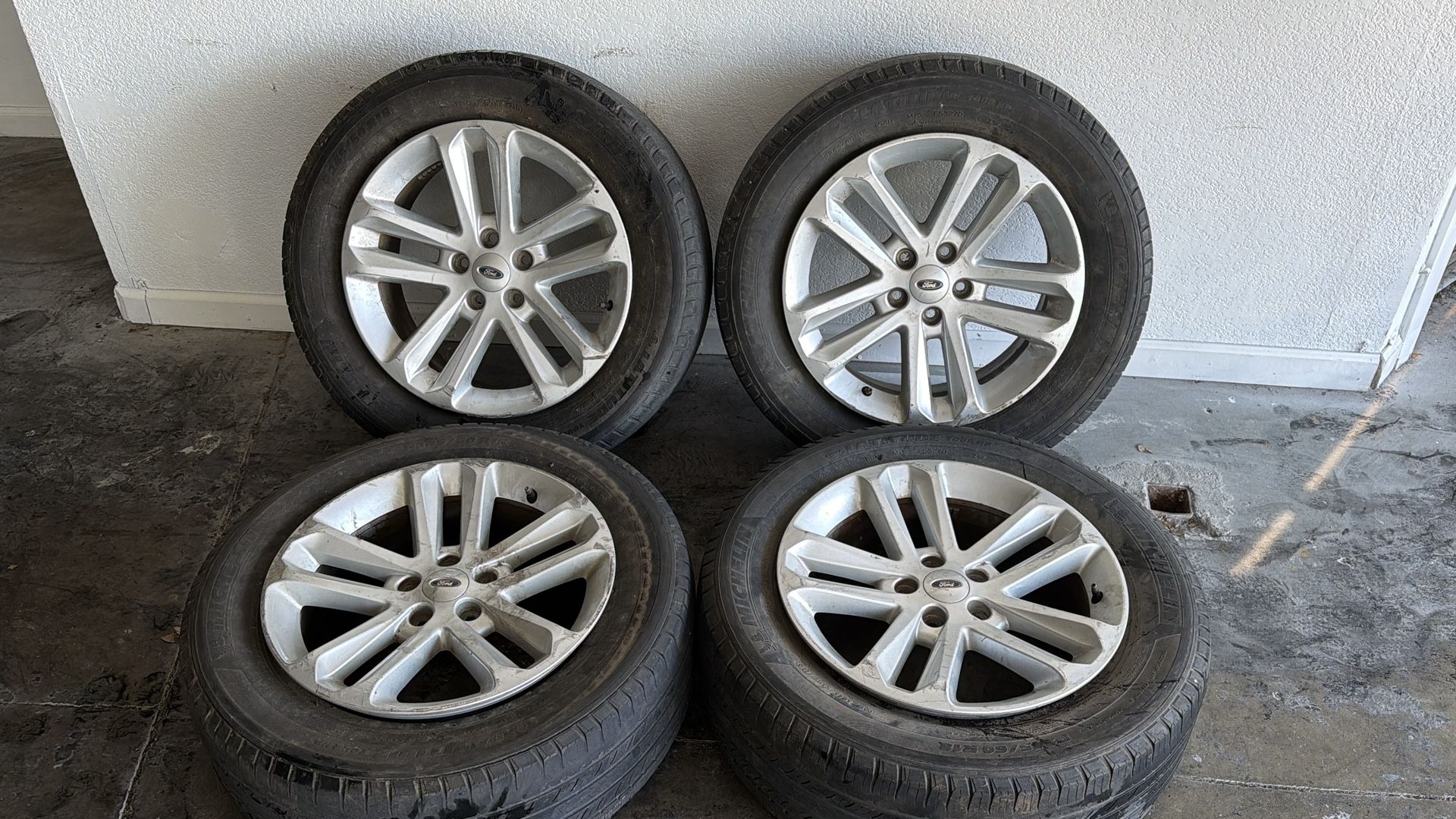 This is a set of four 18-inch factory aluminum wheels originally from a 2011 through 2017 Ford Explorer. The lug pattern is 5 on 4.5 inches (114.3mm), which fits various Ford, Mercury, and Lincoln models, including the Explorer, Escape, Mountaineer, and Aviator. These are genuine FoMoCo (Ford Motor Company) wheels, stamped with a size of 18x8 inches and a 44 offset. All four rims are in good working condition with no bends, cracks, or significant damage, though they do show some scuffs, scratches, and curb rash from regular use. The tires are old and need to be replaced. Please note that the valve stems have been removed, so they currently do not hold air. This set is a great option for a daily driver, commuter, or work vehicle in need of a reliable factory replacement.