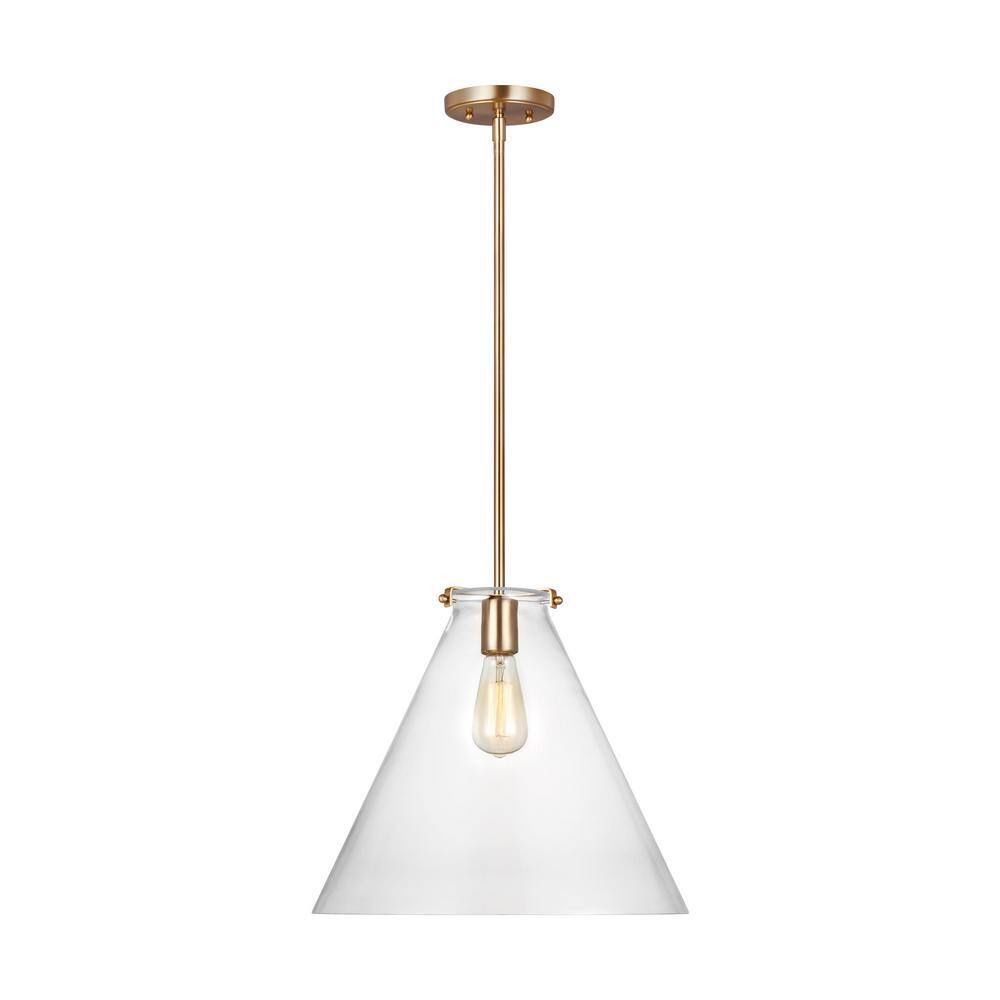 Kate 1-Light Satin Brass Cone Hanging Pendant with Clear Glass Shade MSRP $339.99 The Kate cone pendant is offered in the Satin Brass, Midnight Black, or Brushed Nickel finish. The flared, clear glass shade suspended from a linked chain defines sleek and simple, offering a chance to show-off any style bulb of your choice. The versatility of this fixture makes for a great transitional piece when changing your design or color themes. From the brand formerly known as Sea Gull Lighting Modern, minimalist, damp-rated fixture will complement any dining room, kitchen, or foyer All mounting hardware included plus one 6 in. and three 12 in. stems for customizable hanging height Uses one 60-Watt medium base light bulb sold separately, LED compatible Sloped ceiling compatible Damp rated 120-Volt