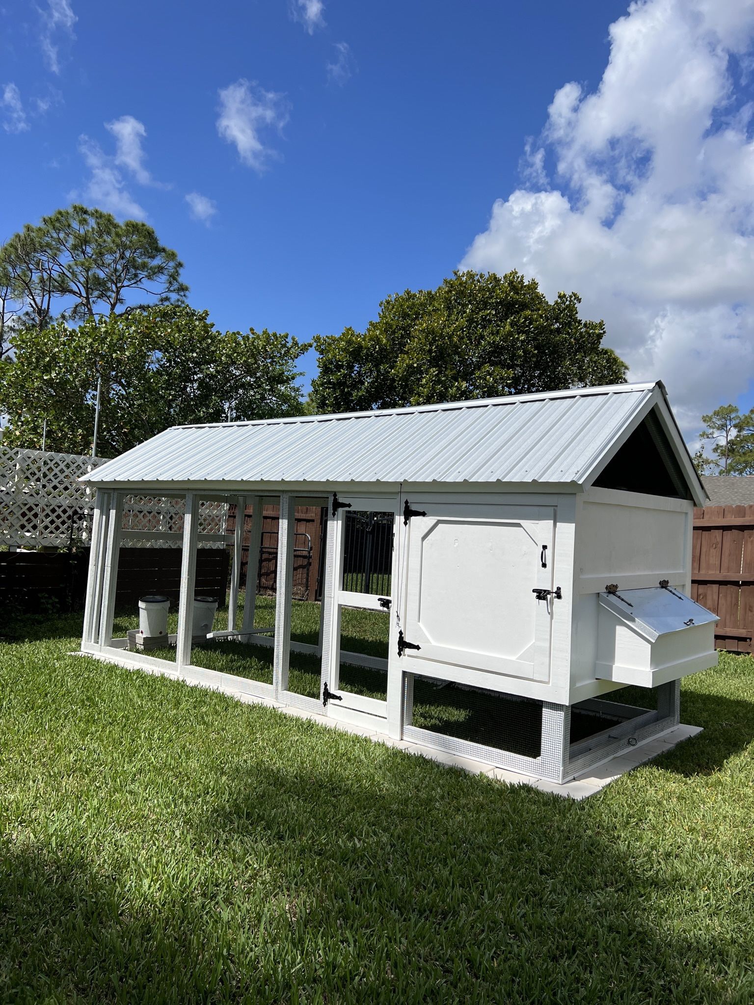 Here is our 6’x18’ Colonial Chicken Coop that was delivered just south of Tampa, Fl. This coop can house 15-20 bids. It has a 4’x6’ house with hardwire cloth run. This coop comes with 4 easy access nesting boxes, four 4’ roosting bars and plenty of ventilation. We build each coop to order so you can design it any way you like. Have a design of your own? Send in a picture and get a free quote.