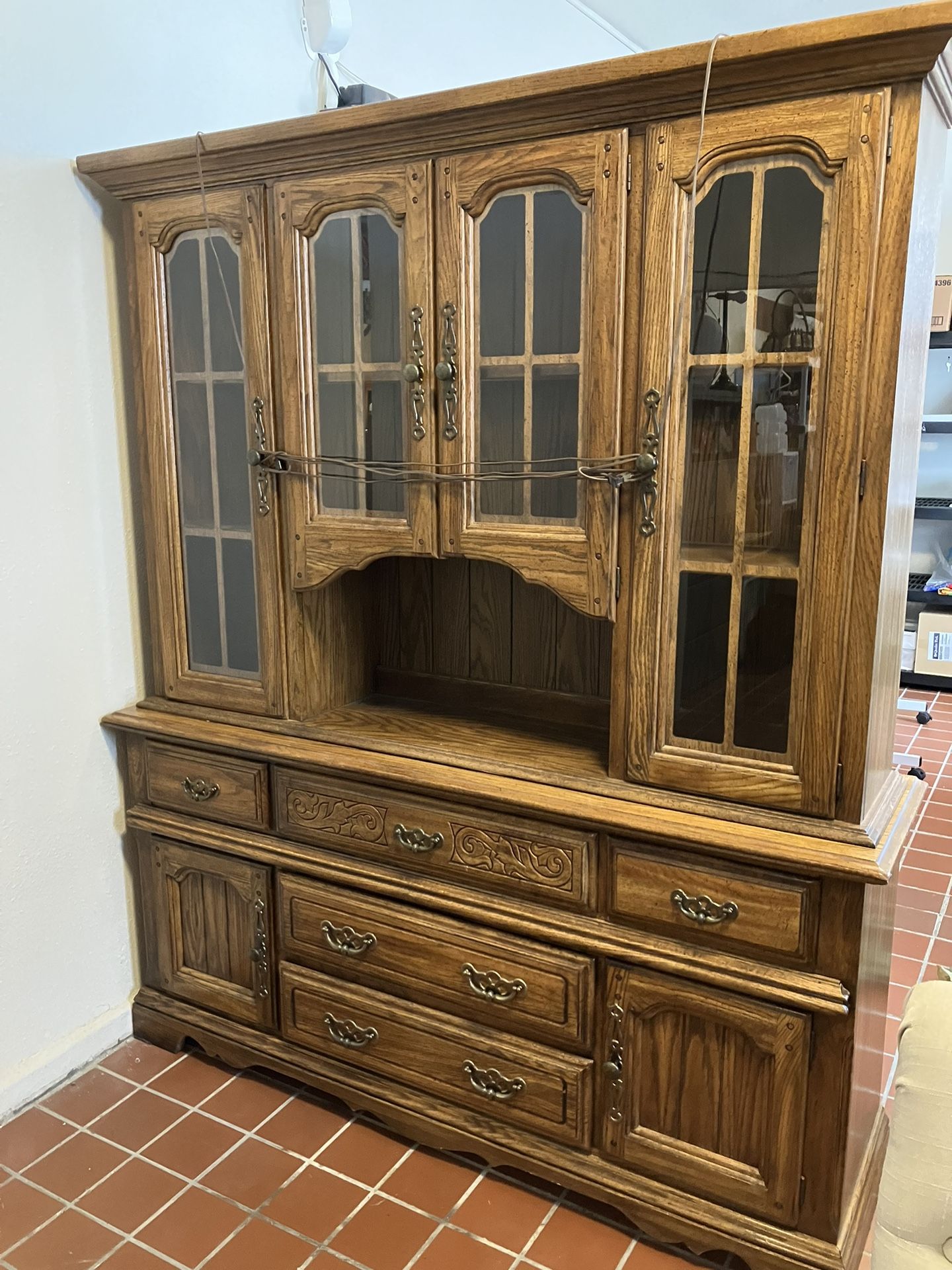 This oak Virginia House china cabinet/hutch is in excellent condition and ready for use! The upper section is lighted for displaying your treasures. The dimensions are 78” H x 66” W x 18” D. The cabinet is located in Banning, CA—local pickup only. I can help with loading. All proceeds go to Faith in Action, a Banning nonprofit that links homeless and low-income people with supportive services to enable them to move toward living independent, successful lives.