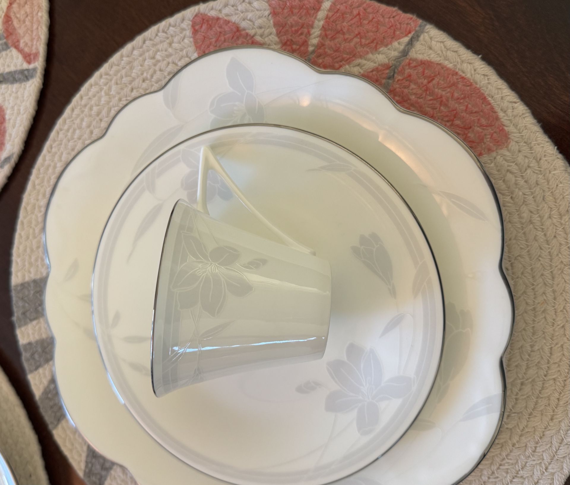 Beautiful Mikasa Ovation Bone China. Service for 8. This set has NEVER BEEN USED and has been carefully stored with all pieces in excellent condition-no chips, cracks, or wear! Classic, elegant white bone China with a delicate floral design that works for both everyday dining or special occasions. It is lightweight yet durable, with the timeless quality Mikasa is known for. Service Set for 8 includes Dinner Plates, Salad Plates, Cups and Saucers, 2 Serving Bowls, Salt and Pepper Shaker, and Butter Plate. Asking $ 80.00. Cash Only. Pickup only.