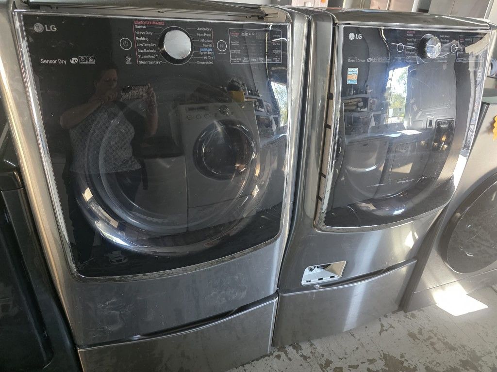 LG 5.2 Cu. Ft. Smart Front Load Washer and 9 Cu. Ft Electric Dryer in Black Steel With Pedestal