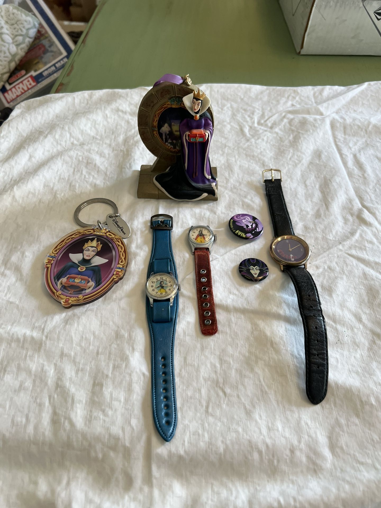 For sale is a lot of vintage snow, White watches, including maleficent, keychain with mirror, sculptural, maleficent, two pins both maleficent. These are all Disney items. The Snow white watch with the black band, the dwarfs circle the watch face. It’s a cool piece. Just needs a new battery. The other two are pre-1970.