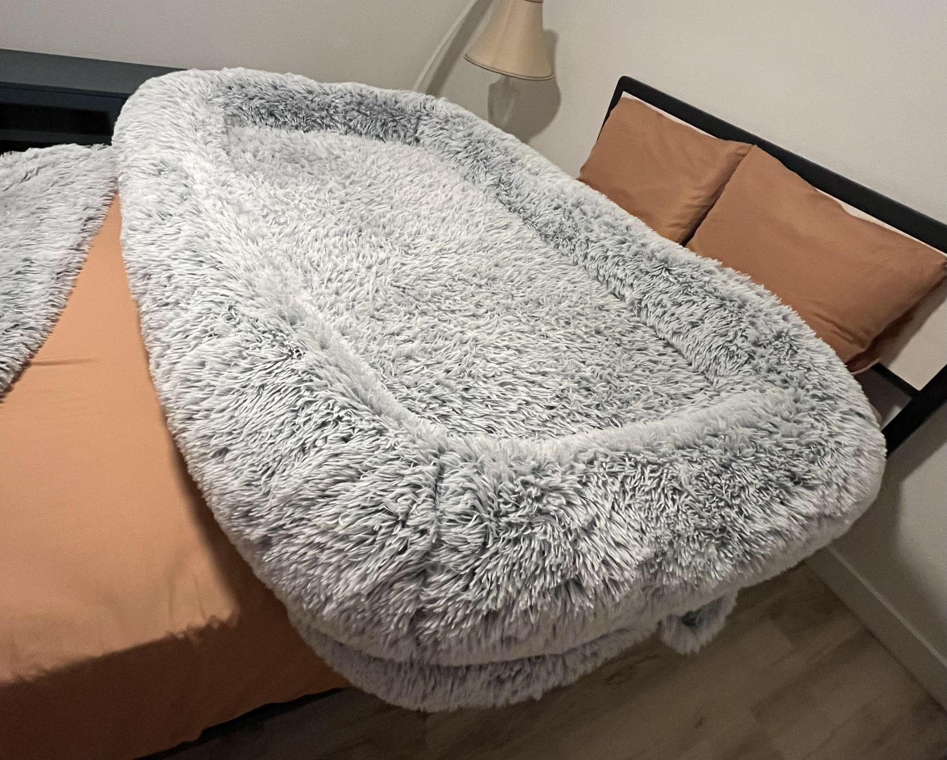 Jumbo Faux Fur Bed with throw blanket– 75” L x 46” W x 10” D – Like New The ultimate comfort! This oversized bed is luxuriously soft, made with high-quality faux fur that’s perfect for snuggling. The raised edge provides added support and a sense of security. My 30 year young granddaughter use this for her bed. We do not have pets so, it has Never used by an animal. 🛏️ Size: 75” L x 46” W x 10” D 📦 Condition: Gently used, excellent condition 🏡 Smoke-free and pet free home.