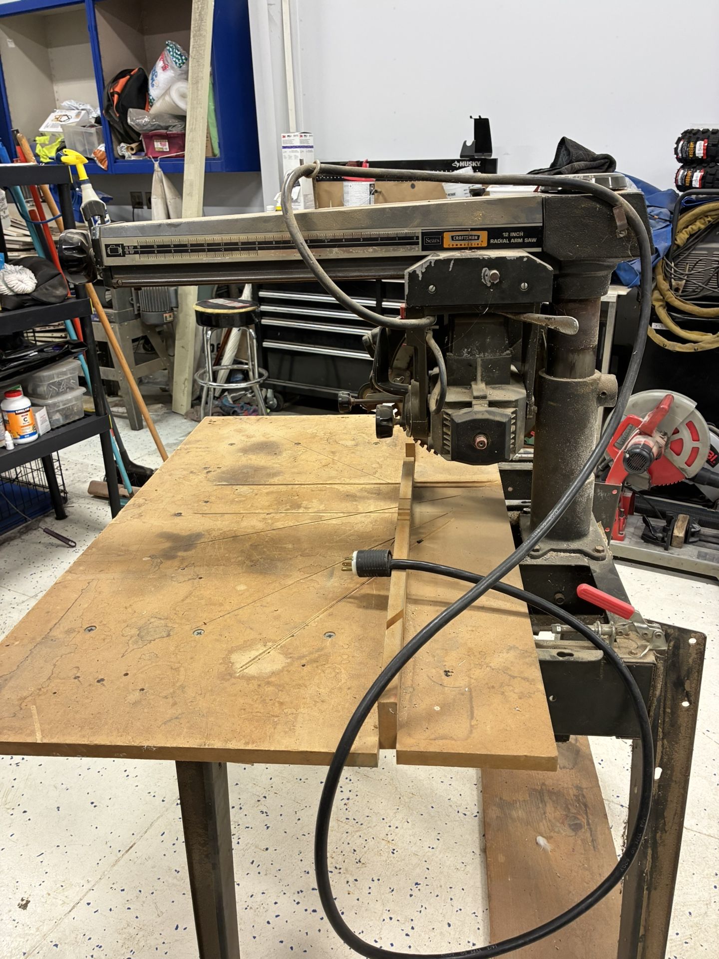 1970 something radial arm saw. American made. Used this to build my house some years back. Worked great. 110/220 motor. Currently wired for 220vac.