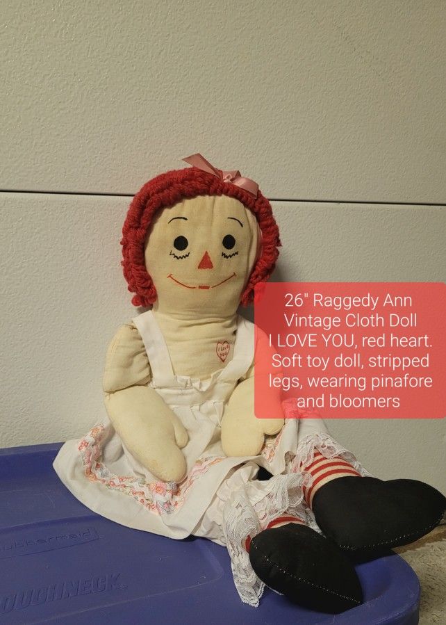 26” Raggedy Ann Doll, Cloth Chest Heart - I LOVE YOU Red and white stripped legs, red yarn hair Vintage for sure!! Vintage Soft Toy