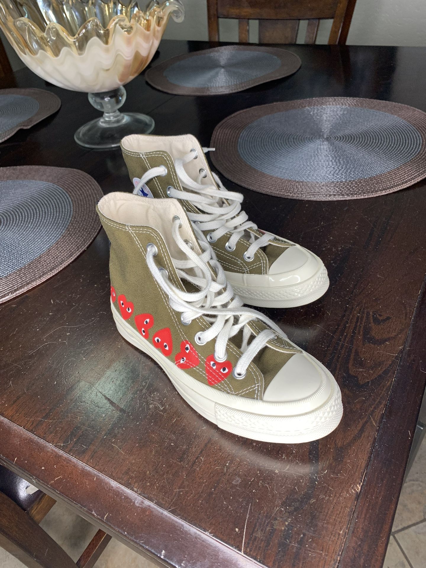 Olive green Converse high tops with red heart design. Comme des Garcons men’s 3 women’s 5 $50
