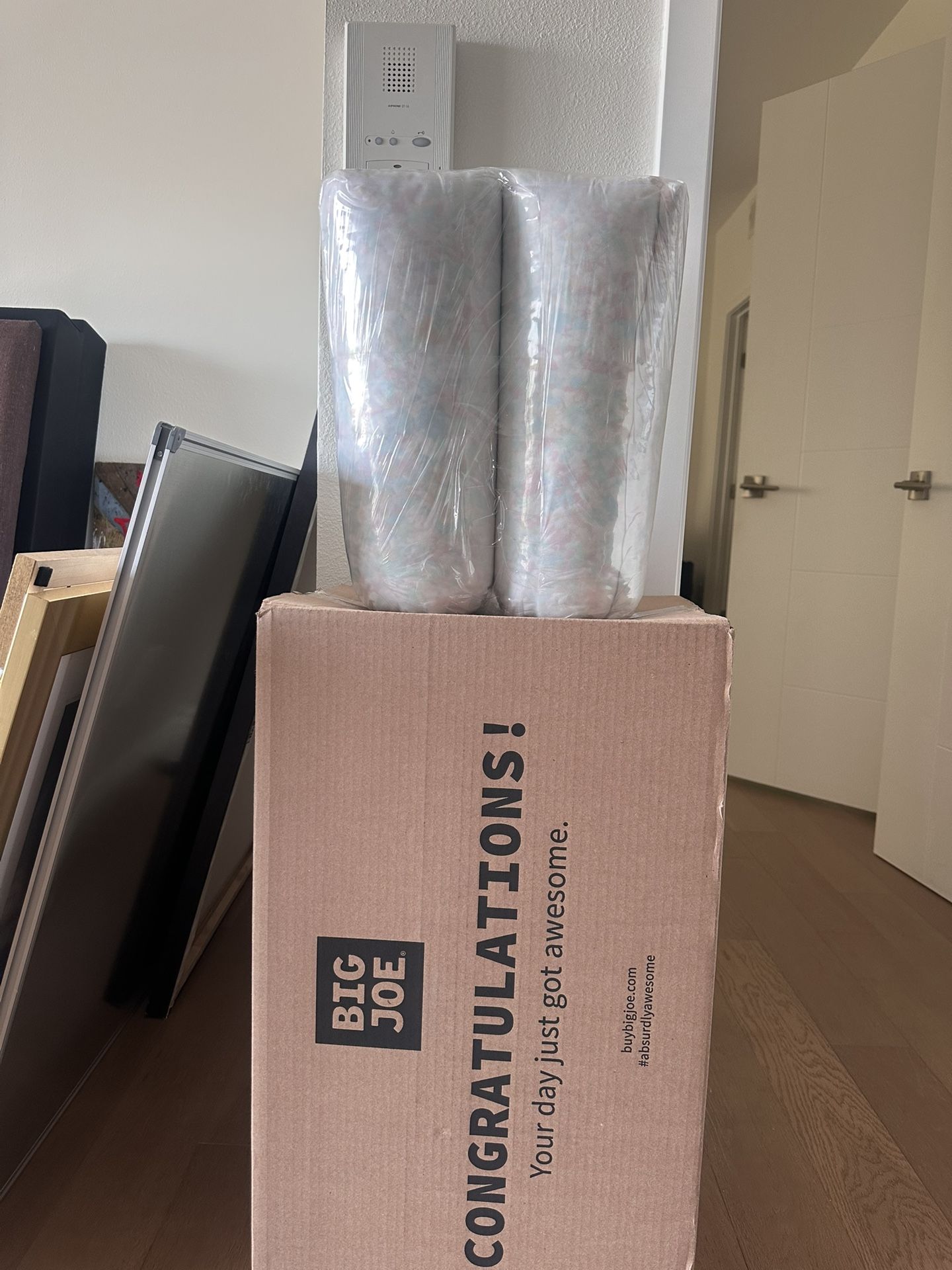 75 liter box of Big Joe polystyrene beans 10 pounds of shredded memory foam Both unopened