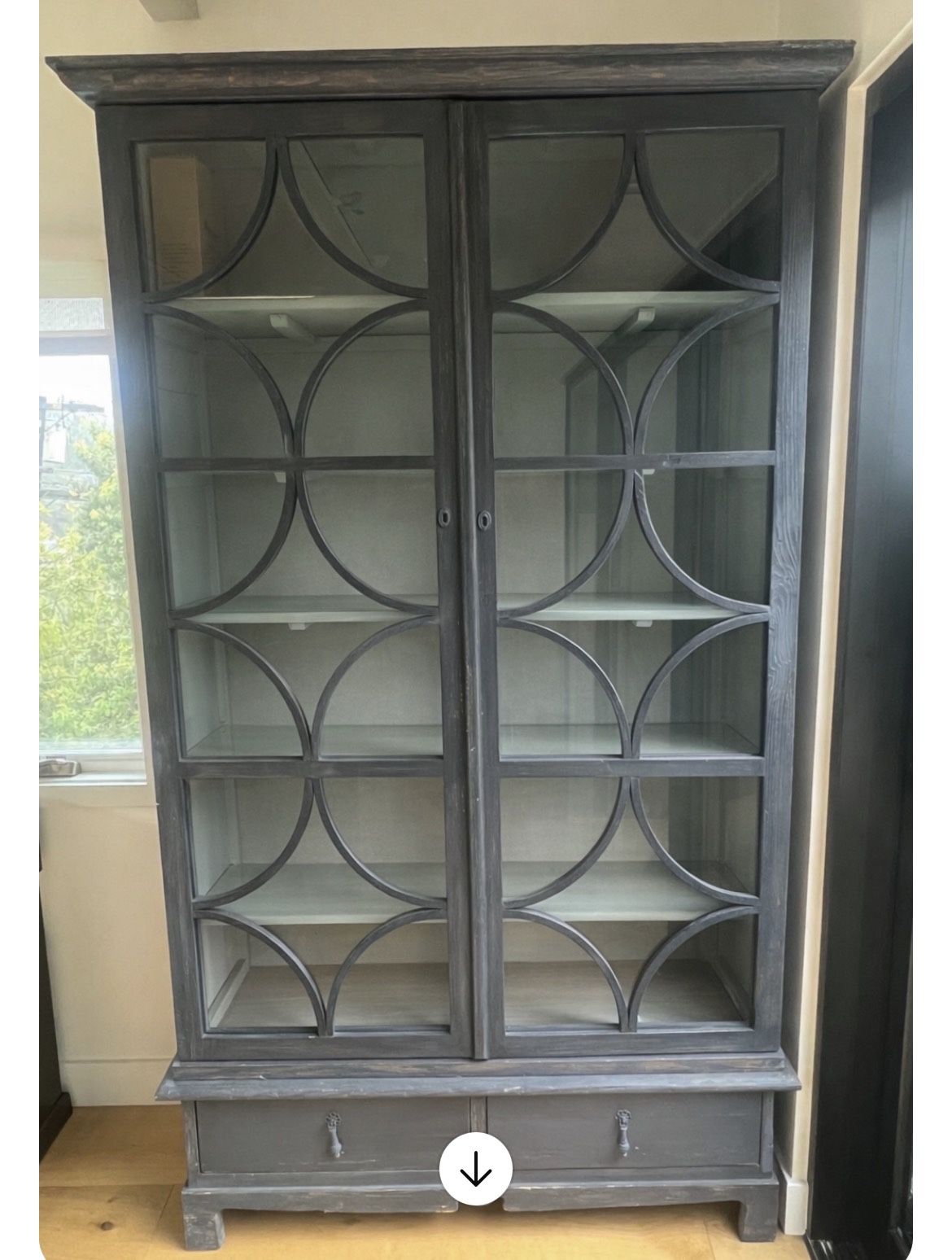 A pair (2) of beautiful tall cabinets from HD Buttercup. Measures 84” tall x 47.25” wide x 17” deep. Super versatile - use it as a book shelf, display case, wardrobe, you name it. Also has 2 pull out drawers on the bottom.