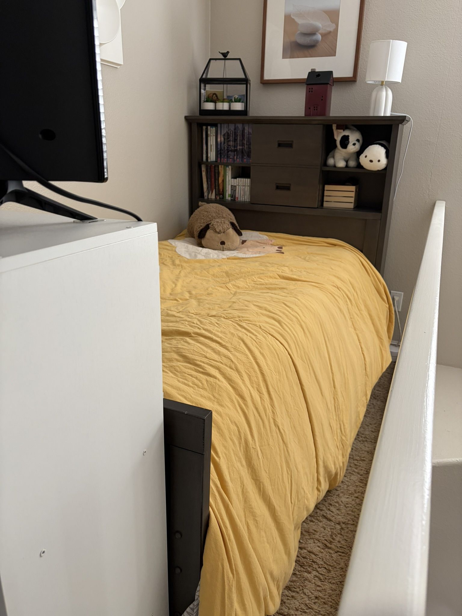 Living Spaces Twin Box Spring, comes with the frame in the picture that has the headboard w/ storage that you can see in the photos.