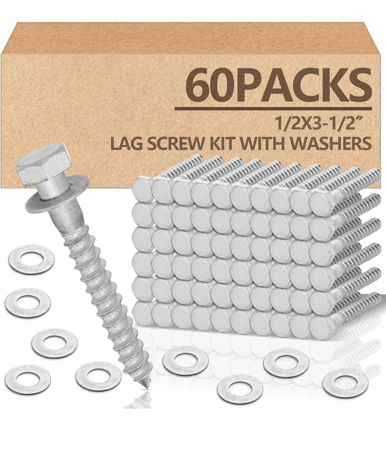 Brand new Tandefio 60 Pack 1/2 x 3''- 1/2'' Lag Screw Kit with Washers Hot Hot Dip Galvanized Hex Lag Bolts Heavy Duty Wood Screws for Wood Decks Fences